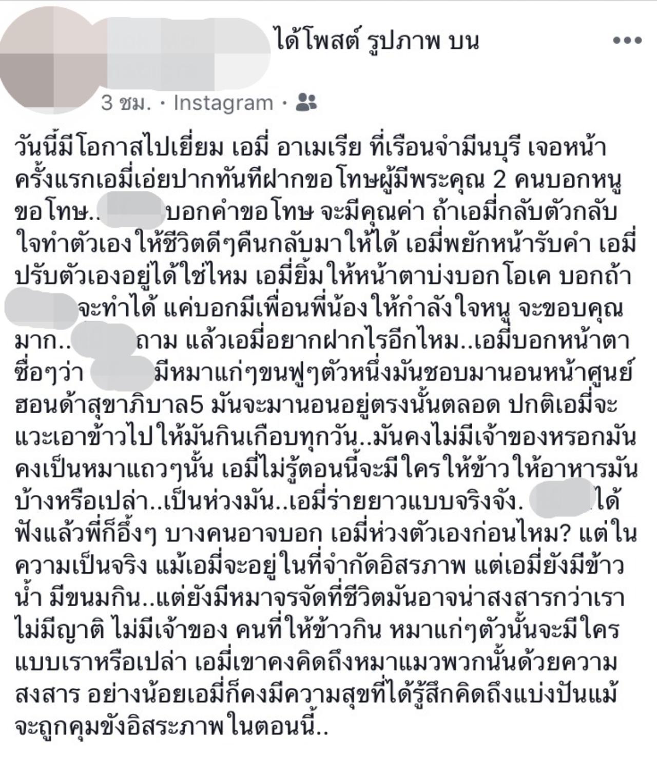 "วันนี้มีโอกาสไปเยี่ยม เอมี่ อาเมเรีย ที่เรือนจำมีนบุรี เจอหน้าครั้งแรกเอมี่เอ่ยปากทันทีฝากขอโทษผู้มีพระคุณ 2 คนบอกหนูขอโทษ..เราบอกคำขอโทษจะมีคุณค่า ถ้าเอมี่กลับตัวกลับใจทำตัวเองให้ชีวิตดีๆ คืนกลับมาให้ได้ เอมี่พยักหน้ารับคำ เอมี่ ปรับตัวเองอยู่ได้ใช่ไหม เอมี่ยิ้มให้หน้าตาบ่งบอกโอเค บอกถ้าเราจะทำได้ แค่บอกมีเพื่อนพี่น้องให้กำลังใจหนู จะขอบคุณมาก..