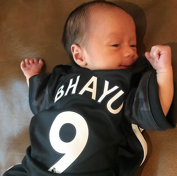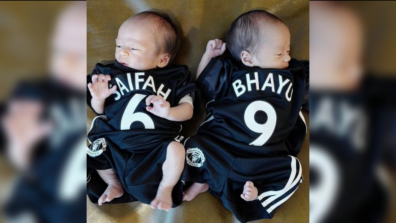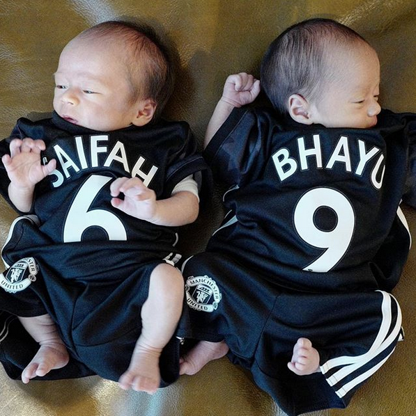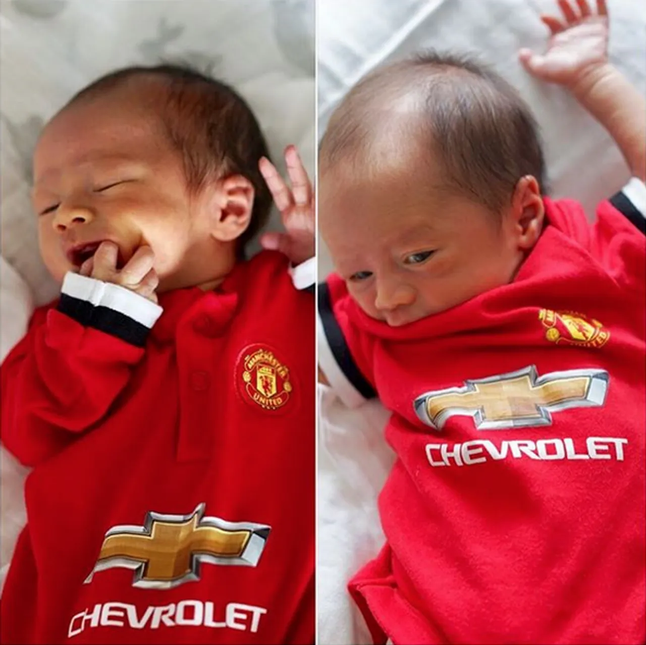 มาวันนี้คุณพ่อน็อต ก็จับลูกชายสุดที่รักทั้ง 2 คนมาใส่เสื้อ แมนยู ทีมโปรดอีกครั้งในวันที่ทีมฟุตบอลชื่อดังลงแข่ง แต่คราวนี้เพื่อให้แฟนๆ ได้แยกออกว่าคนไหนแฝดพี่แฝดน้อง ก็เลยสกรีนชื่อลูกชายทั้ง 2 คนเอาไว้บนเสื้อเรียบร้อยแล้ว โดยแฝดพี่ น้องสายฟ้า ใสเสื้อเบอร์ 6 และแฝดน้องพายุ ใส่เสื้อเบอร์ 9