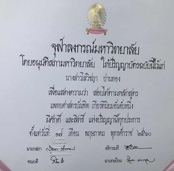 เพราะลูกสาวสุดที่รักเรียนจบคณะแพทยศาสตรบัณทิต และคว้าเกียรตินิยมอันดับหนึ่ง จากจุฬาลงกรณ์มหาวิทยาลัย งานนี้เลยทำเอาแม่ดี้ ปัทมา และพ่อเอ๋ กษมา ปลื้มอกปลื้มใจกับความสำเร็จของลูกสาว พลอย โสวิชญา ปานทอง เป็นอย่างมาก