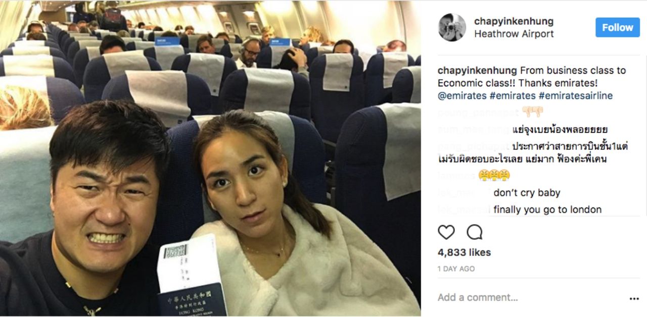 ซึ่งในเวลาต่อมา เคน ฮุง สามีของพลอย ชิดจันทร์ได้โพสต์ภาพของตนเองและภรรยา โดยระบุว่า ได้รับการชดเชยจากสายการบิน แต่ลดชั้นจากที่นั่งชั้นธุรกิจมาเป็นชั้นประหยัด