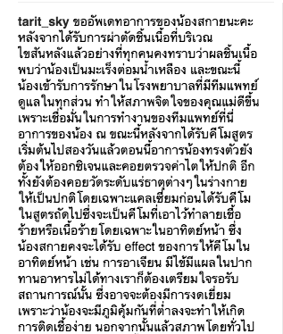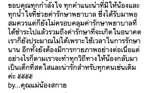 “ขออัพเดตอาการของน้องสกายนะคะ หลังจากได้รับการผ่าตัดชิ้นเนื้อที่บริเวณไขสันหลังแล้ว อย่างที่ทุกคนคงทราบว่าผลชิ้นเนื้อพบว่าน้องเป็นมะเร็งต่อมน้ำเหลือง และขณะนี้น้องเข้ารับการรักษาในโรงพยาบาลที่มีทีมแพทย์ดูแลในทุกส่วน ทำให้สภาพจิตใจของคุณแม่ดีขึ้นเพราะเชื่อมั่นในการทำงานของทีมแพทย์ที่นี่
