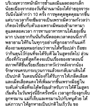 เวลาลูกร้องลูกเจ็บลูกทรมาน แม่ก็เจ็บและทรมานไปกับหนูด้วย ได้แต่ภาวนาให้ลูกหายเป็นปกติในเร็ววัน ขอขอบคุณทุกกำลังใจ ทุกคำแนะนำที่มีให้น้องและทุกน้ำใจที่ช่วยค่ารักษาพยาบาล ซึ่งได้รับมาพอสมควรแต่ก็ยังไม่ครอบคลุมค่ารักษาพยาบาลที่ได้ชำระไปแล้ว