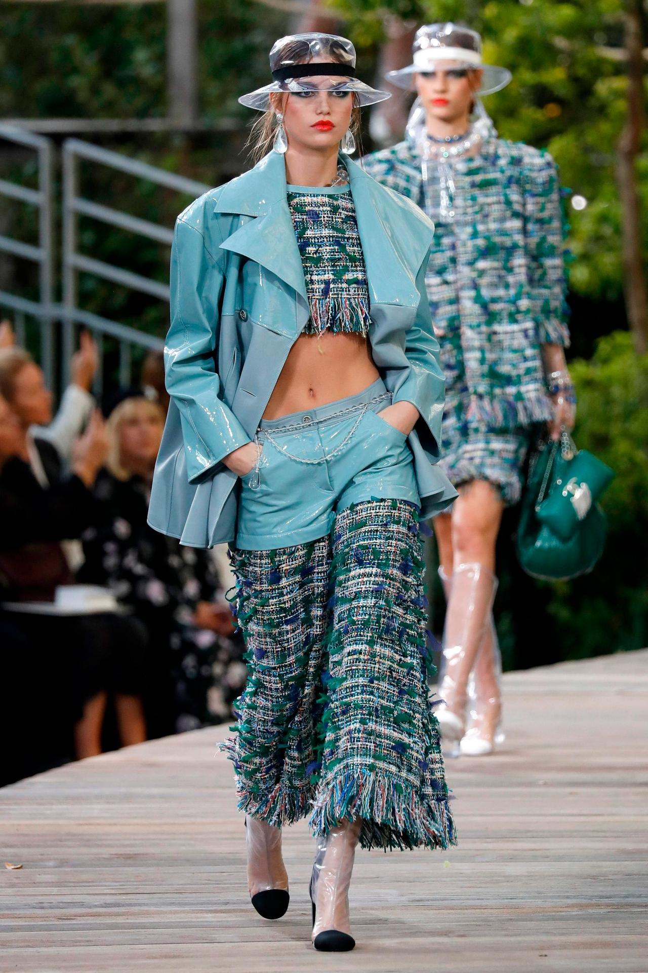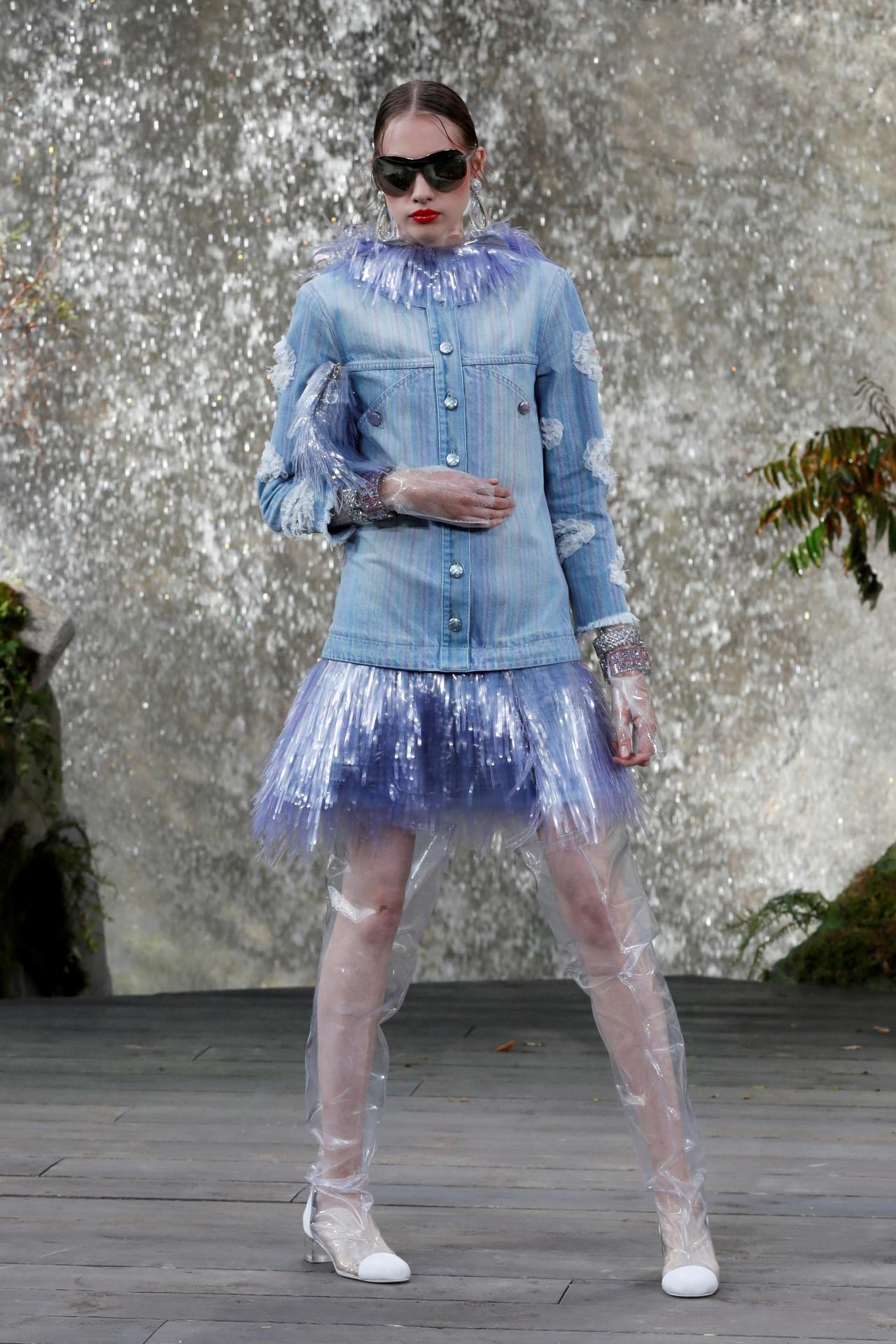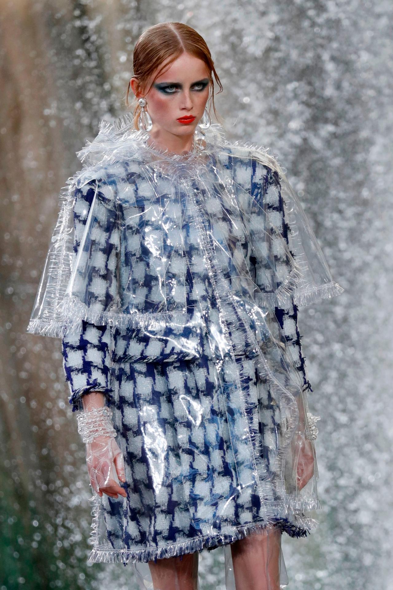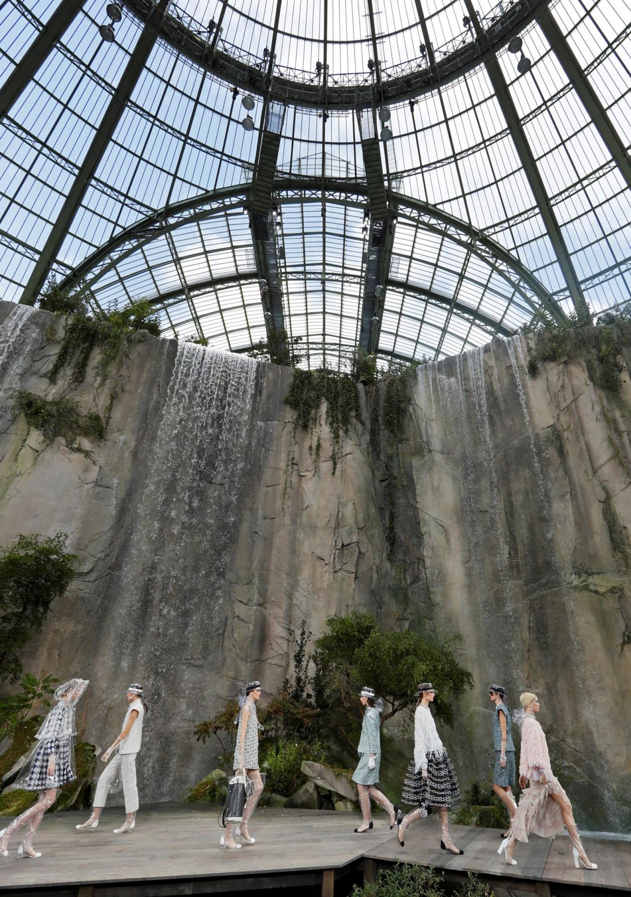 แฟชั่นเซตนี้ไม่ได้แปลกแหวกแนว หวือหวาอะไรมากมายจากรูปแบบเดิมๆ ของชาแนล ยังคงเน้นความโก้หรูสง่าดูดีมีสไตล์เป็นหลัก เหมาะกับหน้าฝนสุดๆ ทั้งหมวก ถุงมือ รองเท้า ล้วนทำมาจากพลาสติกโปร่งใสกันฝนได้ด้วยนะคะ คุณปู่คาร์ล พาลูกๆ หลานๆ หวนกลับไปสู่อ้อมกอดของธรรมชาติอันบริสุทธิ์ยิ่งใหญ่ ยกน้ำตก ต้นไม้ แท่นหิน มาเป็นรันเวย์ได้ตะลึงตาไม่น้อย ชุดทั้งหมดในโชว์นี้จะสวยมากสวยน้อยแค่ไหนนั้น รีบคลิกไปดูกันเลย.