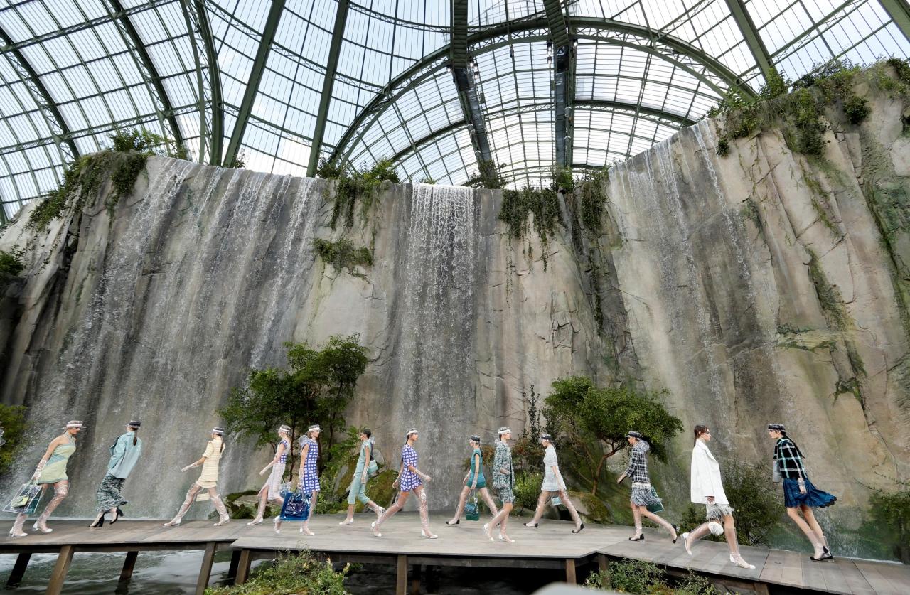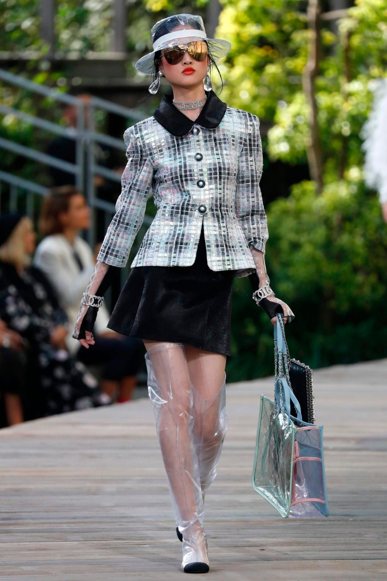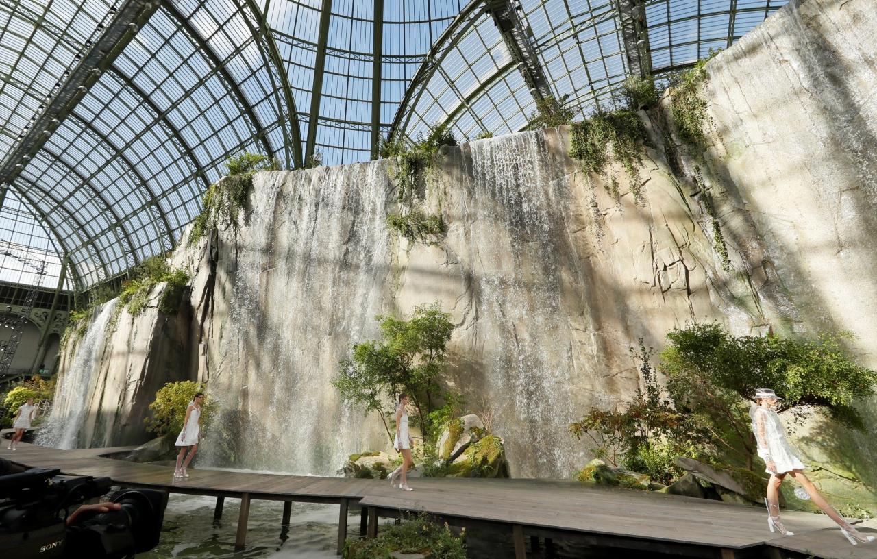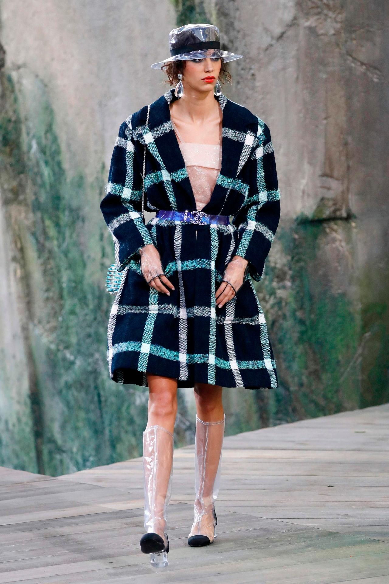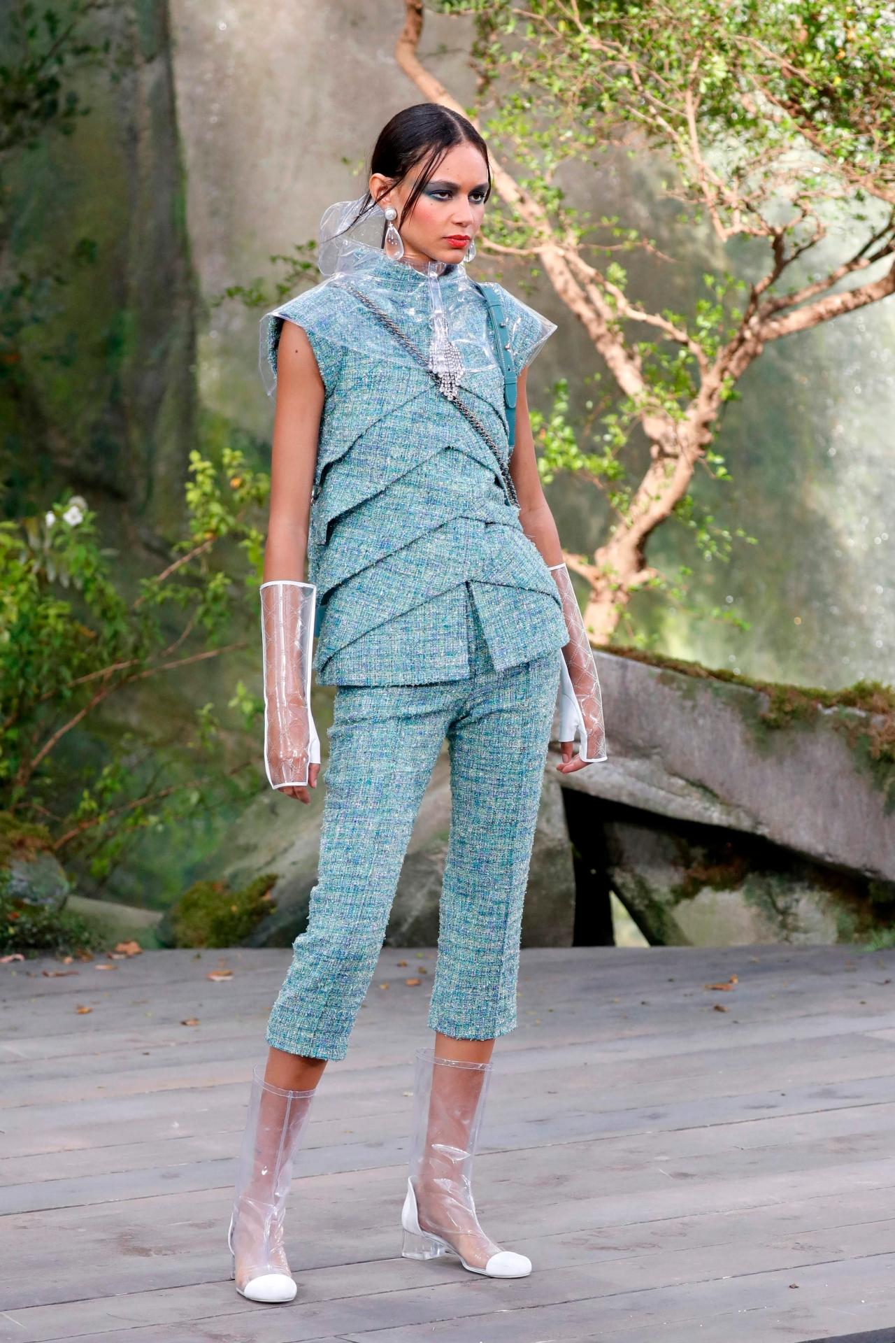 แฟชั่นเซตนี้ไม่ได้แปลกแหวกแนว หวือหวาอะไรมากมายจากรูปแบบเดิมๆ ของชาแนล ยังคงเน้นความโก้หรูสง่าดูดีมีสไตล์เป็นหลัก เหมาะกับหน้าฝนสุดๆ ทั้งหมวก ถุงมือ รองเท้า ล้วนทำมาจากพลาสติกโปร่งใสกันฝนได้ด้วยนะคะ คุณปู่คาร์ล พาลูกๆ หลานๆ หวนกลับไปสู่อ้อมกอดของธรรมชาติอันบริสุทธิ์ยิ่งใหญ่ ยกน้ำตก ต้นไม้ แท่นหิน มาเป็นรันเวย์ได้ตะลึงตาไม่น้อย ชุดทั้งหมดในโชว์นี้จะสวยมากสวยน้อยแค่ไหนนั้น รีบคลิกไปดูกันเลย.