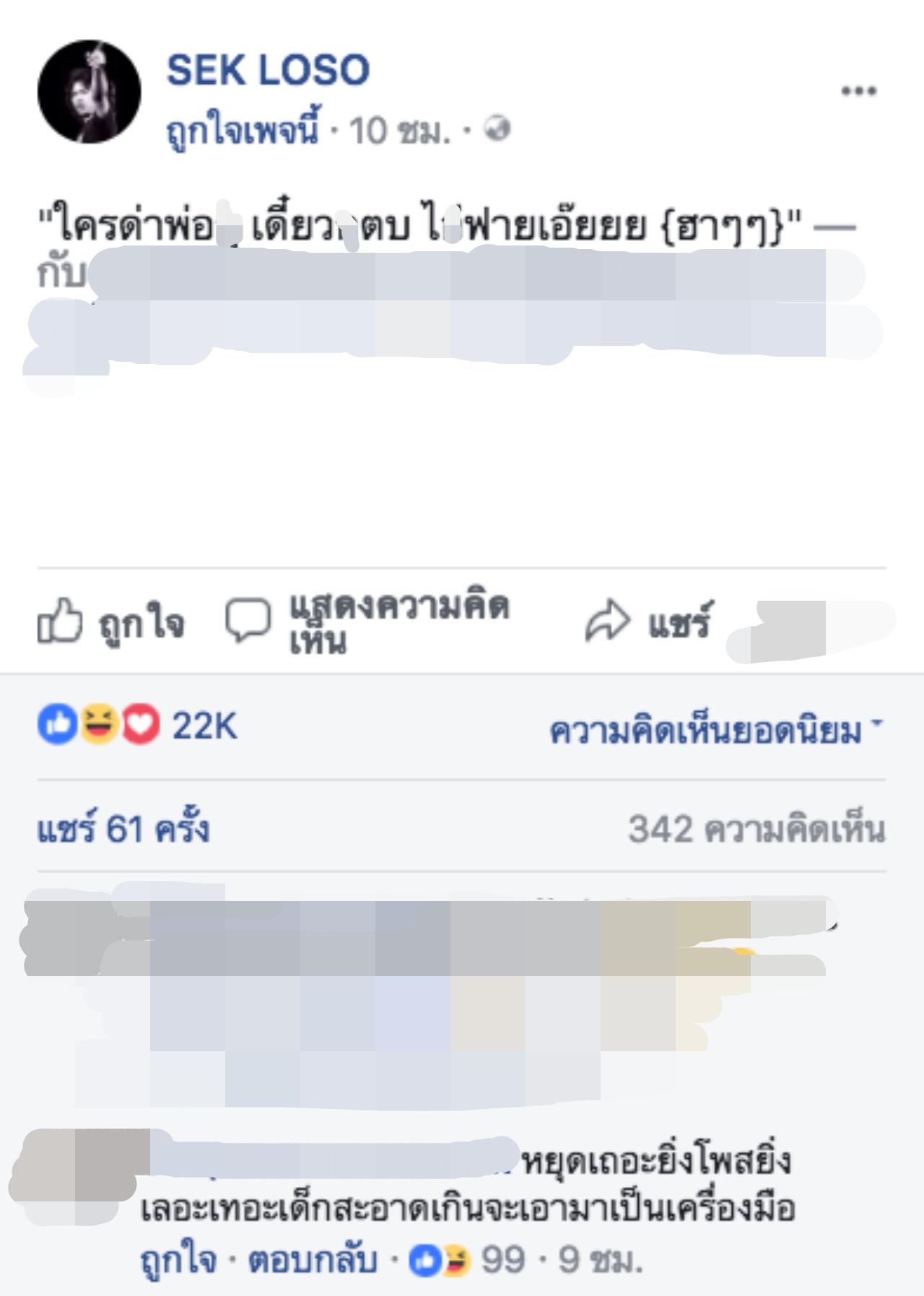 ซึ่งจากโพสต์ "ใครด่าพ่อ_ุ เดี๋ยว_ุตบ ไ_้ฟายเอ๊ยยย {ฮาๆๆ}" นี่แม้ เสก โลโซ จะพูดเหมือนติดตลกแต่ก็มีแฟนๆ ไม่เห็นด้วยพร้อมเข้ามาแสดงความคิดเห็นว่า "หยุดเถอะยิ่งโพสต์ยิ่งเลอะเทอะ เด็กสะอาดเกินจะเอามาเป็นเครื่องมือ"