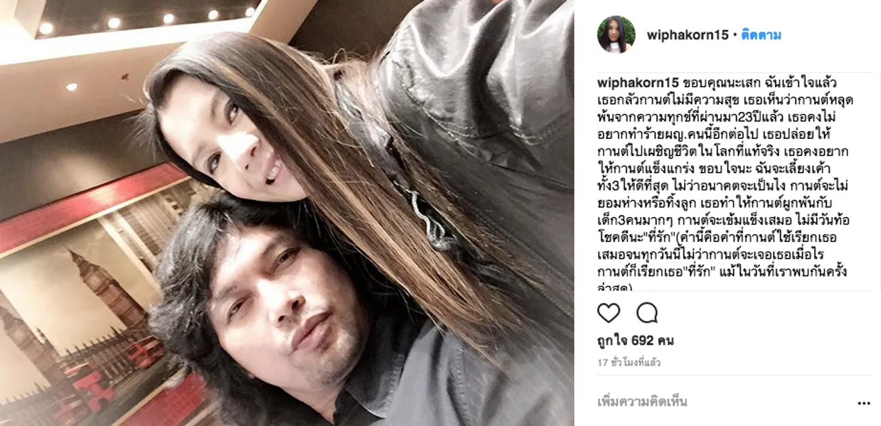 เพราะเจ้าตัวโพสต์ข้อความสุดเศร้าลงในอินสตาแกรมส่วนตัวของตนเอง โดยระบุข้อความประมาณว่า ตอนนี้ตนบอกเข้าใจแล้วทุกอย่างที่เสกทำ และคงไม่อยากทำร้ายตนอีกต่อไป บอกตนจะเข้มแข็ง และสัญญาจะเลี้ยงลูกให้ดีที่สุด ขอให้เสกโชคดีนะที่รัก พร้อมลงรูปคู่กับเสก โลโซ