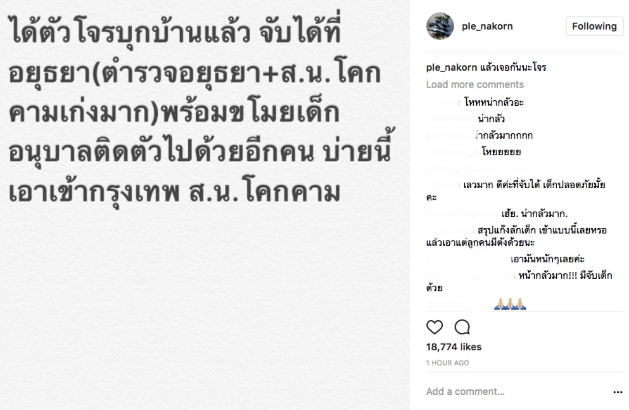 ล่าสุด เปิ้ล นาคร ได้โพสต์ข้อความในอินสตาแกรมส่วนตัว @ple_nakorn โดยระบุว่า "ได้ตัวโจรบุกบ้านแล้ว จับได้ที่อยุธยา (ตำรวจอยุธยา+สน.โคกคราม เก่งมาก) พร้อมขโมยเด็กอนุบาลติดตัวไปด้วยอีกคน บ่ายนี้ เอาเข้ากรุงเทพ สน.โคกคราม"