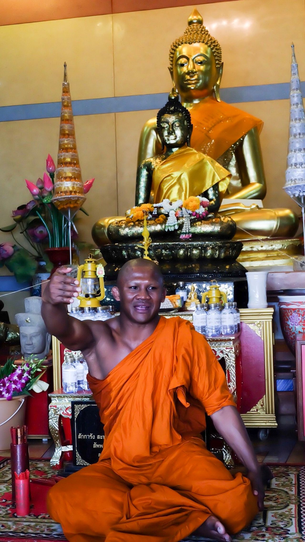 ตอนหลวงพี่เป็นฆราวาส หลวงพี่นำพระบรมฉายาลักษณ์ของพระองค์ท่านติดตัวไปด้วยตลอด? "ถูกต้องโยม รู้มั้ยเพราะอะไร เพราะว่าเหมือนเวลาเราไปทำศึกทุกครั้ง คือเหมือนกับเราให้พระองค์ท่านเป็นแม่ทัพนำทัพเราไป เพราะการขึ้นเวทีมันจะมีเสียงตะโกน เสียงว่าต่างๆ ส่วนมากว่าหาว่าเรากระจอก ไม่มีฝีมือบ้าง ทำให้เราเสียสมาธิได้ เพราะฉะนั้นเราถึงติดพระบรมฉายาลักษณ์ของพระองค์ติดตัวไปด้วยทุกที่เพื่อยึดเหนี่ยวจิตใจ นี่คือบารมีพระองค์ท่านที่ทำให้เรามีชัยชนะกลับมาจนได้ขึ้นเวทีโลกตลอด"
