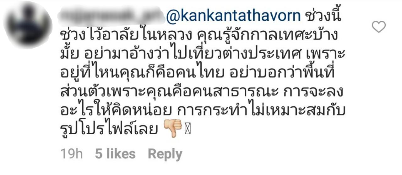โดย กันต์ ได้โพสต์ภาพคู่กับ พลอย ที่ใส่เสื้อคู่สีแดง แต่งานนี้ก็เจอชาวโซเชียลฯ รายหนึ่งเข้ามาวิจารณ์ในไอจีทำนองว่า ช่วงนี้อยู่ในช่วงไว้อาลัย รู้จักกาลเทศะบ้าง อย่ามาอ้างว่าไปเที่ยวต่างประเทศ เพราะอยู่ที่ไหนก็เป็นคนไทย อย่าบอกว่าพื้นที่ส่วนตัวเพราะคุณคือคนสาธารณะ การจะลงอะไรให้คิดหน่อย การกระทำไม่เหมาะสมกับรูปโปรไฟล์เลย แต่ก็มีบางคนเข้ามาแสดงความคิดว่าจะไปบังคับคนอื่นทำไม