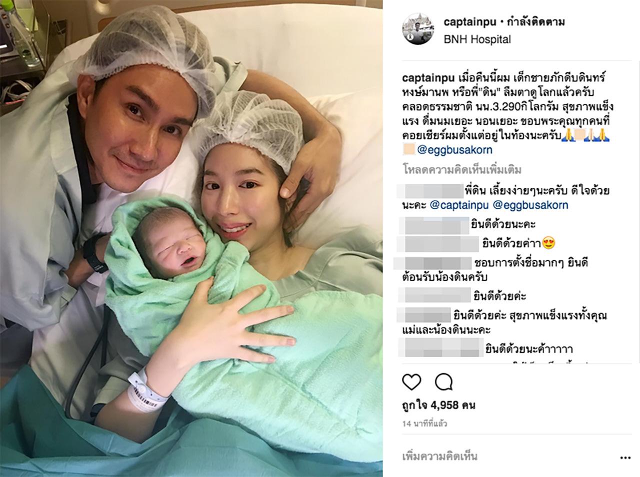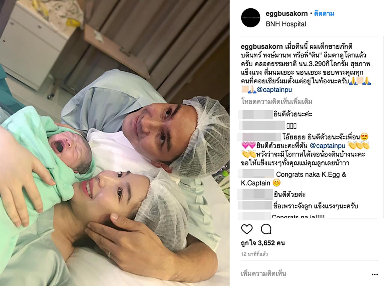 โดยในช่วงสายของวันนี้ ทั้งหนุ่มกัปตันและสาวเอ้ก ได้โพสต์รูป 3 คนพ่อแม่ลูก พร้อมข้อความว่า “เมื่อคืนนี้ผม เด็กชายภักดีบดินทร์ หงษ์มานพ หรือพี่ "ดิน" ลืมตาดูโลกแล้วครับ คลอดธรรมชาติ นน. 3.290 กิโลกรัม สุขภาพแข็งแรง ดื่มนมเยอะ นอนเยอะ ขอบพระคุณทุกคนที่คอยเชียร์ผมตั้งแต่อยู่ในท้องนะครับ”