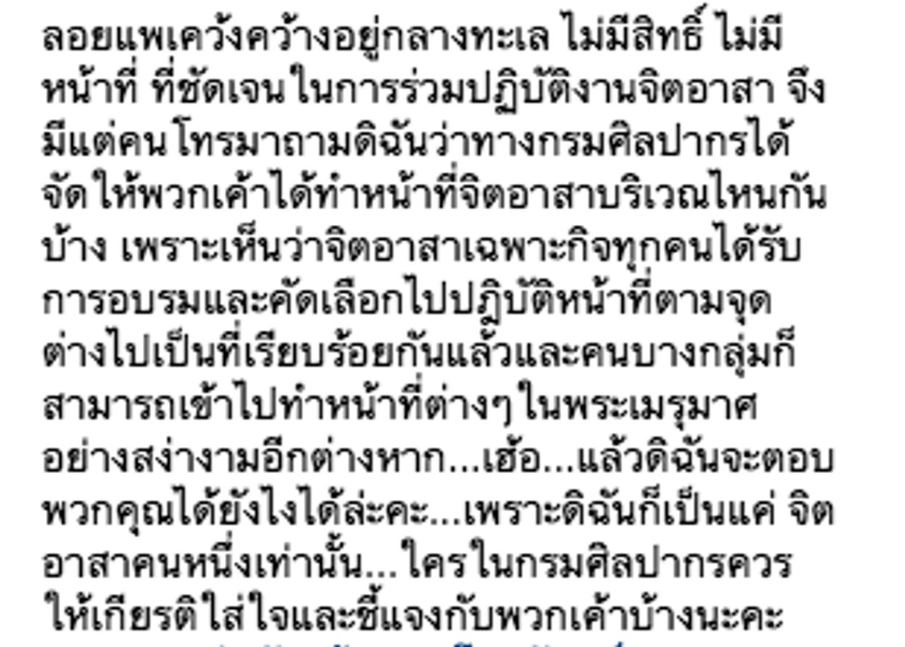 แต่พอส่งมอบงานแล้วก็เหมือนโดนลอยแพเคว้งคว้างอยู่กลางทะเล ไม่มีสิทธิ์ ไม่มีหน้าที่ที่ชัดเจนในการร่วมปฏิบัติงานจิตอาสา จึงมีแต่คนโทรมาถามดิฉันว่า ทางกรมศิลปากรได้จัดให้พวกเค้าได้ทำหน้าที่จิตอาสาบริเวณไหนกันบ้าง เพราะเห็นว่าจิตอาสาเฉพาะกิจทุกคนได้รับการอบรมและคัดเลือกไปปฏิบัติหน้าที่ตามจุดต่างๆ ไปเป็นที่เรียบร้อยกันแล้ว