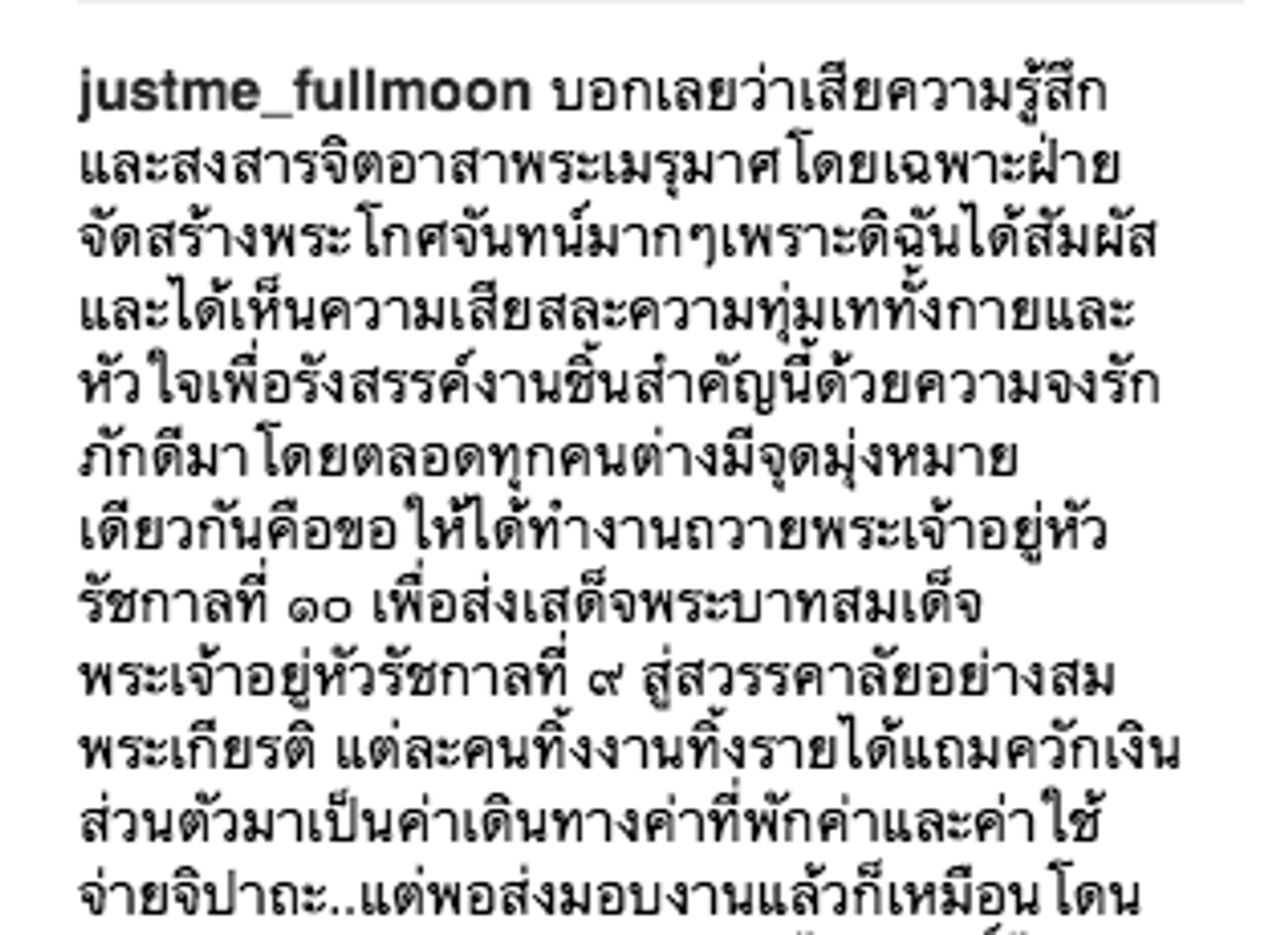 "บอกเลยว่าเสียความรู้สึก และสงสารจิตอาสาพระเมรุมาศ โดยเฉพาะฝ่ายจัดสร้างพระโกศจันทน์มากๆ เพราะดิฉันได้สัมผัสและได้เห็นความเสียสละ ความทุ่มเททั้งกายและหัวใจ เพื่อรังสรรค์งานชิ้นสำคัญนี้ด้วยความจงรักภักดีมาโดยตลอด