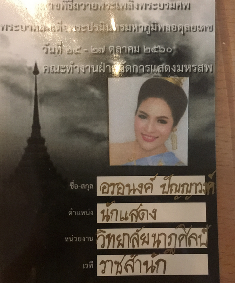 โดยล่าสุด เจ้าตัวได้โพสต์รูปบัตรประจำตัว พร้อมกับรูปแต่งกายในชุดโขนแบบเต็มยศ และข้อความระบุว่า “ซ้อมใหญ่พระราชพิธีถวายพระเพลิงพระบรมศพพระบาทสมเด็จพระปรมินทรมหาภูมิพลอดุลยเดช โขน ตอนพระรามคืนนคร เวทีราชสำนัก”