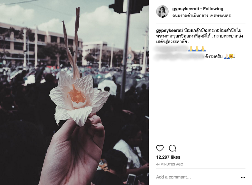 ส่วนหนุ่ม อั๊ต อัษฎา ก็เป็นอีกคนที่มีความตั้งใจ ได้เดินทางไปร่วมถวายดอกไม้จันทน์ ณ เมรุมาศจำลอง ที่ลานพระบรมรูปทรงม้า ตั้งแต่เช้าตรู่เช่นกัน และนางแบบสาว ลูกหมี รัศมี ได้ไปร่วมถวายดอกไม้จันทน์ เพื่อน้อมส่งเสด็จสู่สวรรคาลัยในพระราชพิธีที่วัดอรุณราชวราราม นักแสดงสาว ยิปซี คีรติ ก็เป็นอีกคนที่เดินทางไปถวายดอกไม้จันทน์ที่ ถนนราชดำเนินกลาง เขตพระนคร แม้คนจะเยอะแค่ไหน แต่ก็ใจสู้