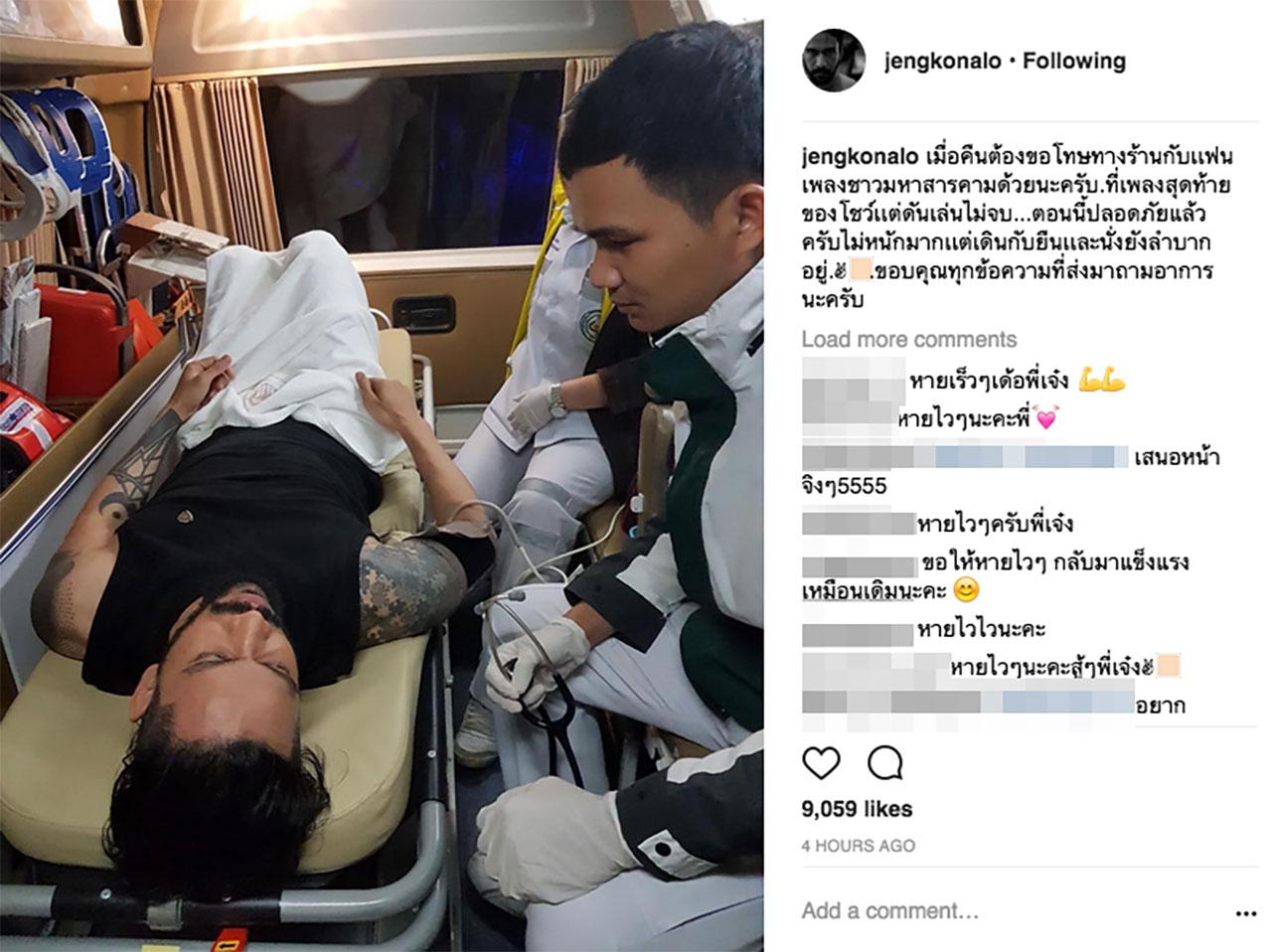 หลังจากนั้น หนุ่มเจ๋ง ก็ได้โพสต์รูปพร้อมข้อความลงในอินสตาแกรมของตัวเองว่า “เมื่อคืนต้องขอโทษทางร้านกับแฟนเพลงชาวมหาสารคามด้วยนะครับ ที่เพลงสุดท้ายของโชว์แต่ดันเล่นไม่จบ..ตอนนี้ปลอดภัยแล้วครับ ไม่หนักมากแต่เดินกับยืนและนั่งยังลำบากอยู่ ขอบคุณทุกข้อความที่ส่งมาถามอาการนะครับ”