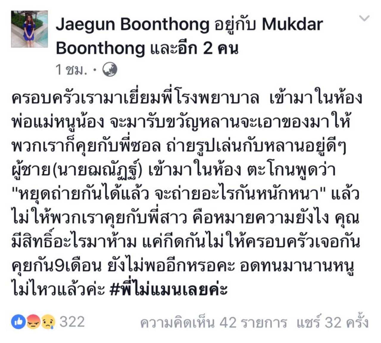 แจกัน ฉะแรงไปแล้วว่า "ครอบครัวเรามาเยี่ยมพี่โรงพยาบาล เข้ามาในห้อง พ่อแม่หนูน้อง จะมารับขวัญหลาน จะเอาของมาให้ พวกเราก็คุยกับพี่ซอล ถ่ายรูปเล่นกับหลานอยู่ดีๆ ผู้ชาย (นายฌณัฏฐ์) เข้ามาในห้อง ตะโกนพูดว่า "หยุดถ่ายกันได้แล้ว จะถ่ายอะไรกันหนักหนา" แล้วไม่ให้พวกเราคุยกับพี่สาว คือหมายความยังไง คุณมีสิทธิ์อะไรมาห้าม แค่กีดกันไม่ให้ครอบครัวเจอกันคุยกัน 9 เดือน ยังไม่พออีกเหรอคะ อดทนมานานหนูไม่ไหวแล้วค่ะ #พี่ไม่แมนเลยค่ะ