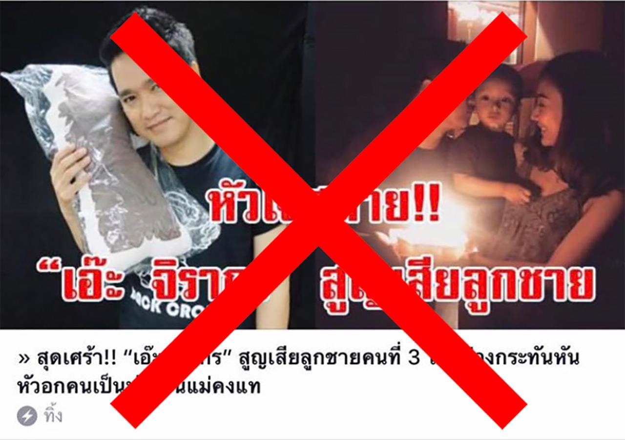 แต่ในเว็บข่าวนั้นก็เอารูปน้องพีเจไปลงแล้วบอกว่าลูกชายเสียชีวิต เราก็เลยงงว่าเฮ้ย กว่าจะรู้เพศประมาณสัก 3-5 เดือนนะ อันนี้เพิ่งท้องเอง ไม่จริงครับ คือหนึ่งเรื่องรู้เพศ สองเรื่องเสียชีวิต คือในหลักการของแพทย์จะพูดว่าเสียชีวิตก็น่าจะได้แหละ แต่ว่าหลักการคนเราเองเนี่ยคือเพิ่งตรวจได้ว่าท้อง แล้วน้องก็หลุดไปเพราะผนังมดลูกไม่แข็งแรงแค่นั้นเอง”