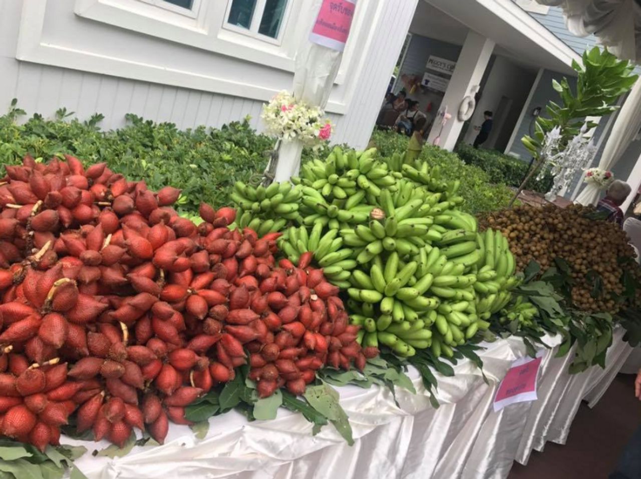 แต่นอกจากบรรยากาศของงานแต่งที่หวานชื่น อบอุ่น อบอวลไปด้วยความสุขแล้ว เรื่องของของชำร่วยที่เตรียมไว้แจกแขกที่มาร่วมงานก็น่าสนใจไม่แพ้กัน เพราะเจ้าบ่าวเจ้าสาวจัดเตรียมของชำร่วยเป็นผลไม้สด ทั้งกล้วย ลำไย และสละ นับว่าเป็นของชำร่วยงานแต่งงานที่ไม่เหมือนใคร และแปลกตาทีเดียว