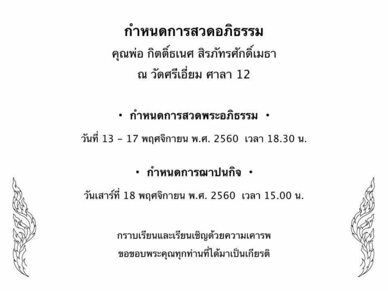 สำหรับพิธีสวดพระอภิธรรม คุณพ่อ กิตติ์ธเนศ สิรภัทรศักดิ์เมธา จะจัดขึ้นในวันที่ 13-17 พ.ย. เวลา 18.30 น. ที่วัดศรีเอี่ยม ศาลา 12 และมีกำหนดฌาปนกิจในวันเสาร์ที่ 18 พ.ย. เวลา 15.00 น. โดยตอนนี้ แพทตี้ อยู่ญี่ปุ่น จะบินกลับไทยมาร่วมงานสวดอภิธรรมคุณพ่อในคืนวันที่ 14 พ.ย.