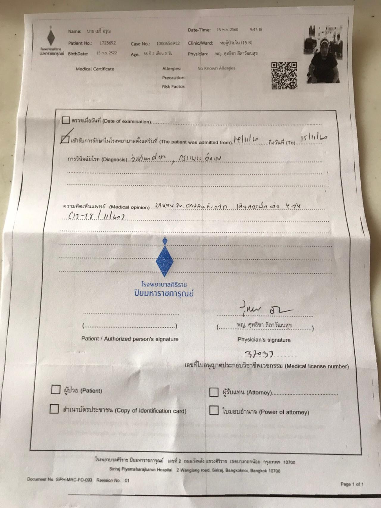 และในวันที่ 13 พ.ย. เพราะยังมีงานต่อ ทางวงลาบานูนจึงไปเดินทางไปเล่นคอนเสิร์ตที่ จ.ระยอง แต่สามารถขึ้นเล่นได้แค่ 45 นาที ต้องขอหยุดกลางคันเนื่องจากไม่ไหว เล่นเสร็จต้องตีรถกลับบ้านที่ กทม. ทันที และในวันที่ 14 พ.ย. ตอนบ่ายขณะอยู่ที่บ้านเมธียังรู้สึกหมดแรง จน ผจก.ต้องพาส่ง รพ.ศิริราช ปิยมหาราชการุณย์ คุณหมอเจาะเลือดไปตรวจ แอดมิดที่ รพ.ศิริราชฯ คืนแรก