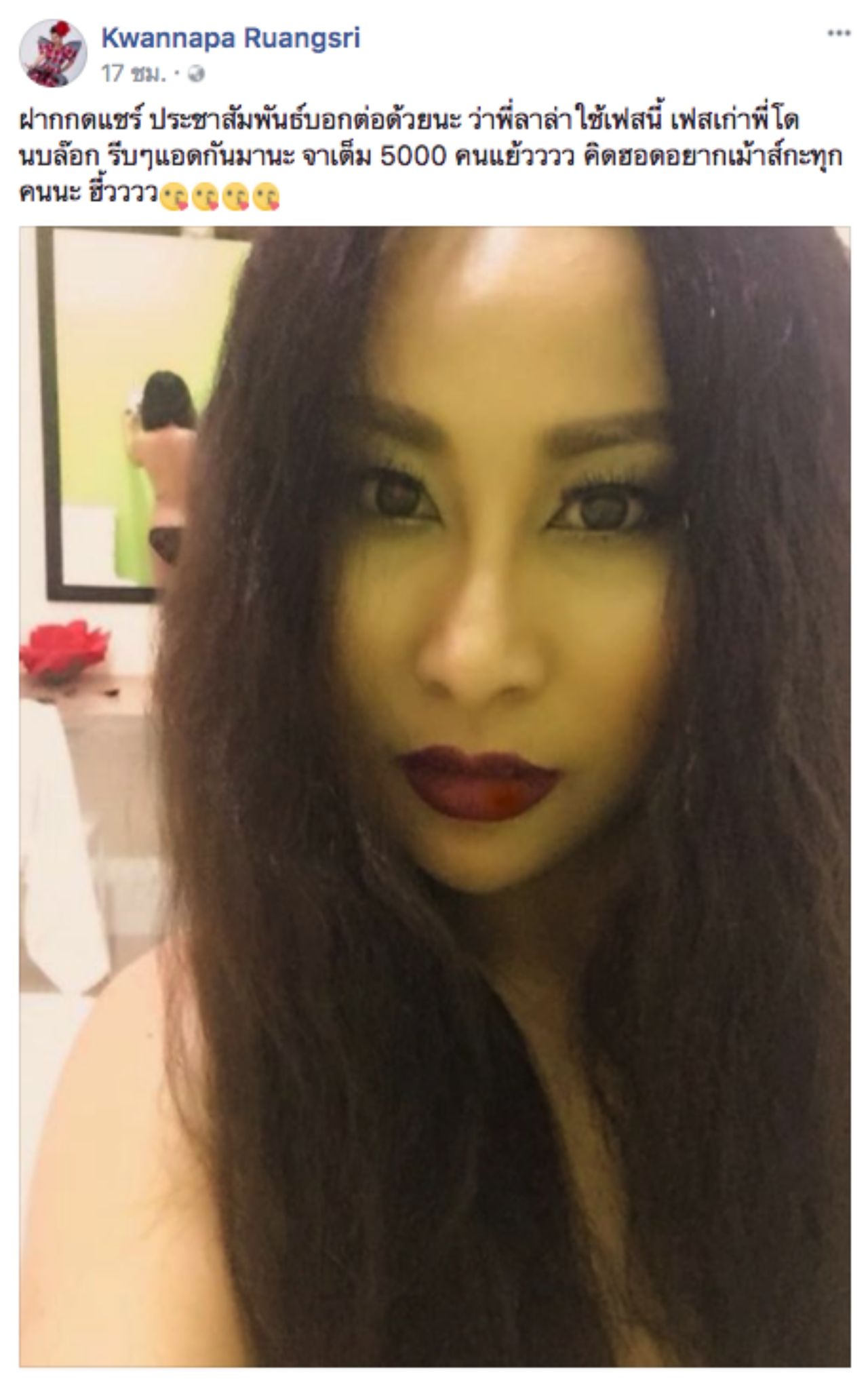 "ฝากกดแชร์ ประชาสัมพันธ์บอกต่อด้วยนะ ว่าพี่ลาล่าใช้เฟซบุ๊กนี้ เฟซบุ๊กเก่าพี่โดนบล็อก รีบๆ แอดกันมานะ จะเต็ม 5,000 คนแล้ว คิดฮอดอยากเม้าส์กับทุกคนนะ ฮี้วววว"