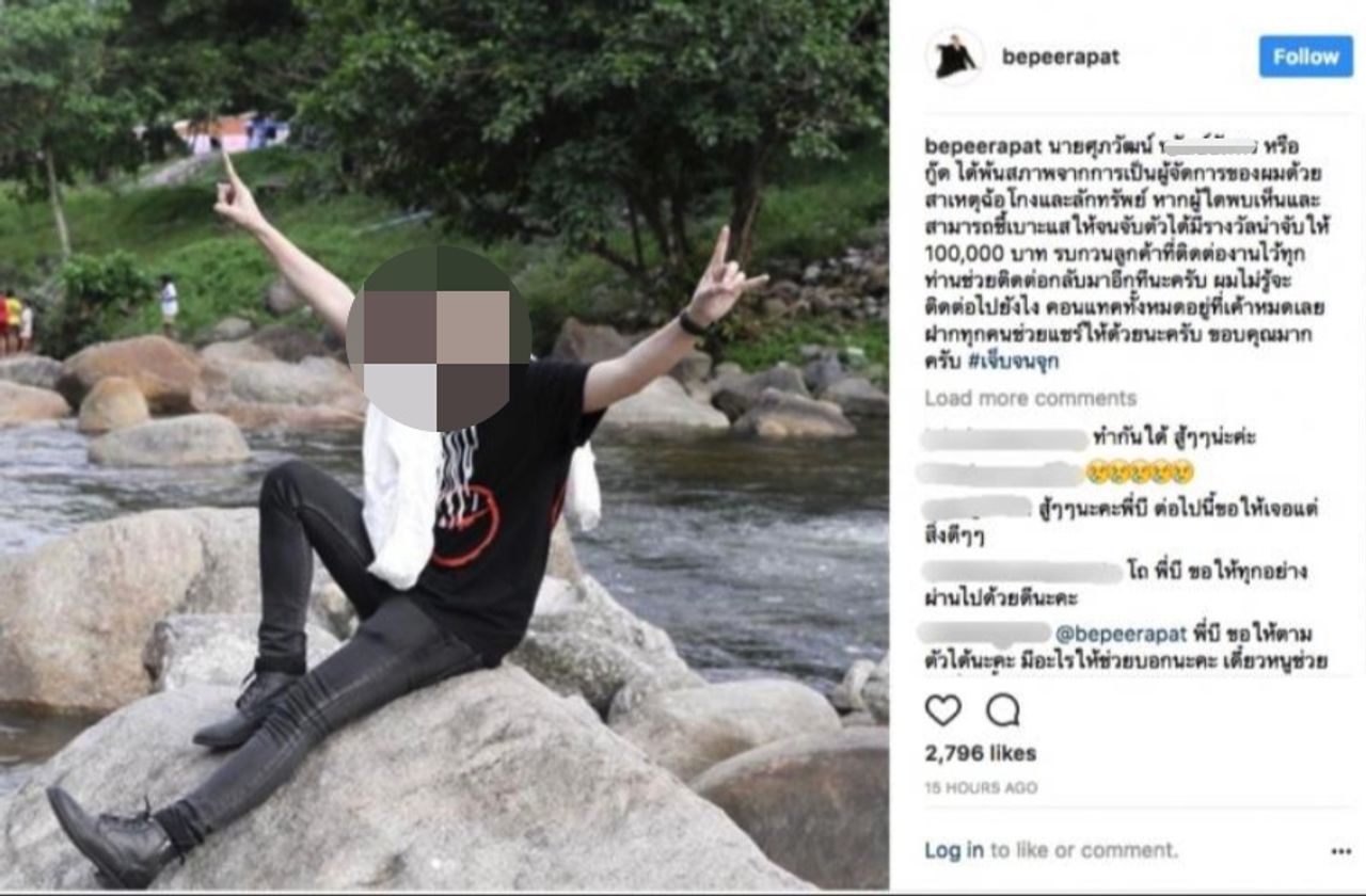 โดย บี ได้โพสต์ภาพและบัตรประชาชนของ กู๊ด อดีตผู้จัดการส่วนตัว และเขียนข้อความว่า “นายศุภวัฒน์ (สงวนนามสกุล) หรือ กู๊ด ได้พ้นสภาพจากการเป็นผู้จัดการของผมด้วยสาเหตุฉ้อโกงและลักทรัพย์ หากผู้ใดพบเห็นและสามารถชี้เบาะแสให้จนจับตัวได้มีรางวัลนำจับให้ 100,000 บาท รบกวนลูกค้าที่ติดต่องานไว้ทุกท่านช่วยติดต่อกลับมาอีกทีนะครับ ผมไม่รู้จะติดต่อไปยังไง คอนแทคทั้งหมดอยู่ที่เค้าหมดเลย ฝากทุกคนช่วยแชร์ให้ด้วยนะครับ ขอบคุณมากครับ #เจ็บจนจุก"