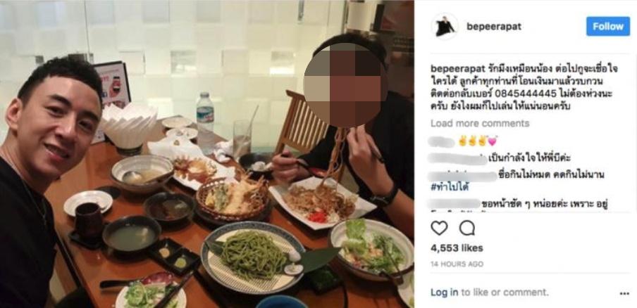 นอกจากนี้ บี ยังได้โพสต์ภาพตอนที่ไปทานอาหารกับ กู๊ด และเขียนข้อความอีกว่า “รักมึงเหมือนน้อง ต่อไปกูจะเชื่อใจใครได้ ลูกค้าทุกท่านที่โอนเงินมาแล้วรบกวนติดต่อกลับเบอร์ 0845444445 ไม่ต้องห่วงนะครับ ยังไงผมก็ไปเล่นให้แน่นอนครับ”.