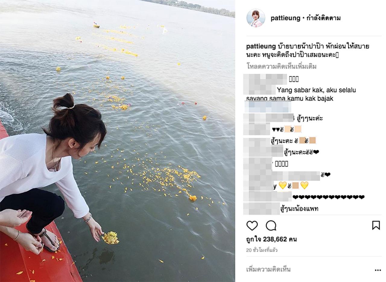 ล่าสุดแพตตี้ได้นำอัฐิของคุณพ่อไปทำพิธีลอยอังคาร พร้อมกับโพสต์ข้อความผ่านอินสตาแกรมของตัวเองว่า “บ๊ายบายน๊าปาป๊า พักผ่อนให้สบายนะคะ หนูจะคิดถึงปาป๊าเสมอนะคะ” ซึ่งหลังจากที่สาวแพตตี้ได้ลงภาพและข้อความดังกล่าวไป ก็มีแฟนๆ เข้ามาคอมเมนต์ให้กำลังใจสาวแพตตี้ให้เข้มแข็งและเป็นกำลังใจให้มากมาย