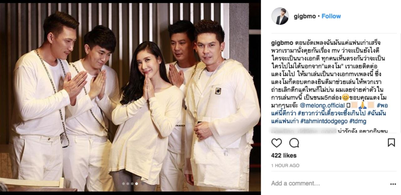 หลังจากที่มีกระแสข่าวการกลับมารีเทิร์นของแฟนเก่าอย่าง แตงโม นิดา และ ด็อจ บีมิกซ์ ออกมา ทำเอาแฟนๆ ที่เคยเชียร์คู่นี้ออกอาการลุ้นตัวโก่ง แต่ล่าสุดแฟนๆ ก็ได้ถึงบางอ้อ เมื่อหนุ่มๆ แก๊งบีมิกซ์ พร้อมใจกันยกมือไหว้ขอบคุณสาวแตงโม หลังจากที่ฝ่ายหญิงยอมมาเล่นเอ็มวีเพลงให้ แถมยังจ่ายค่าตัวเป็นขนมแค่ 5 กล่องเท่านั้น โดยหนุ่มโก้ บีมิกซ์ ได้โพสต์รูปและข้อความลงในอินสตาแกรมส่วนตัวว่า