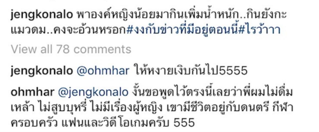ซึ่งหลังจากที่หนุ่มเจ๋งลงรูปคู่ไป ก็มีแฟนๆ เข้ามาให้กำลังใจ และหนึ่งในนั้นก็คือ นักร้องหนุ่ม โอม แห่งวงค็อกเทล หรือที่หลายคนรู้จักในนาม หน้ากากหอยนางรม ผู้ที่ได้ชื่อว่ารักภรรยามากที่สุดอีกคนของวงการ เข้ามาคอมเมนต์การันตีนิสัยของหนุ่มเจ๋งใต้ภาพว่า “งั้นขอพูดไว้ตรงนี้เลยว่าพี่ผมไม่ดื่มเหล้า ไม่สูบบุหรี่ ไม่มีเรื่องผู้หญิง เขามีชีวิตอยู่กับดนตรี กีฬา ครอบครัว แฟน และวิดีโอเกมครับ 555”