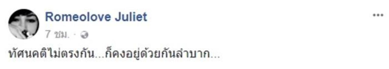 โดยเธอได้โพสต์ข้อความว่า “บทสรุปของการจบชีวิตคู่...กับประโยค Classic...ทัศนคติไม่ตรงกัน...ฉันเพิ่งเข้าใจมันวันนี้เอง...อะไรจะเกิดก็ให้มันเกิด...ช่างแม่ม...แยกค่ะ” และยังมีการโพสต์ข้อความอีกว่า “ทัศนคติไม่ตรงกัน...ก็คงอยู่ด้วยกันลำบาก...”