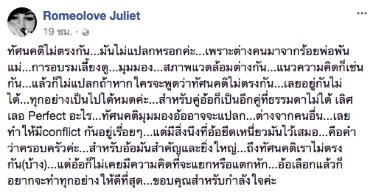 สำหรับคู่อ้อก็เป็นอีกคู่ที่ธรรมดา ไม่ได้เลิศเลอ Perfect อะไร...ทัศนคติมุมมองอ้ออาจจะแปลก...ต่างจากคนอื่น...เลยทำให้มี conflict กันอยู่เรื่อยๆ...แต่มีสิ่งนึงที่อ้อยึดเหนี่ยวมันไว้เสมอ...คือคำว่าครอบครัวค่ะ...สำหรับอ้อมันสำคัญและยิ่งใหญ่...ถึงทัศนคติเราไม่ตรงกัน(บ้าง)...แต่อ้อก็ไม่เคยมีความคิดที่จะแยกหรือแตกหัก...อ้อเลือกแล้วก็อยากจะทำทุกอย่างให้ดีที่สุด...ขอบคุณสำหรับกำลังใจค่ะ”