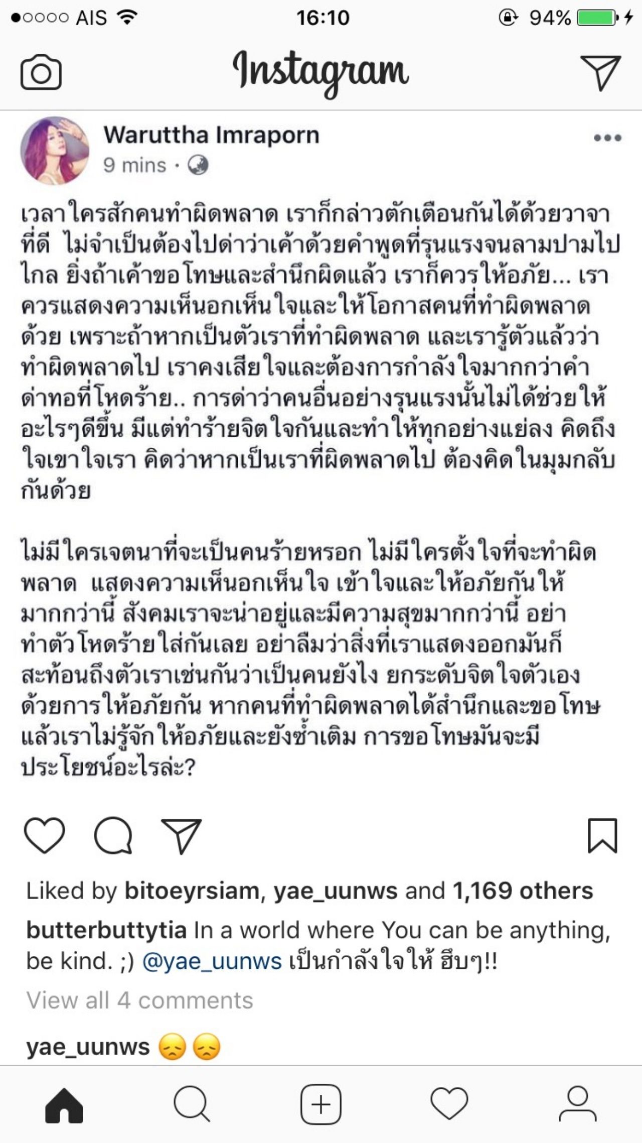 พร้อมแคปชั่นว่า “In a world where You can be anything, be kind. ;) (ในโลกที่คุณสามารถเป็นอะไรก็ได้ ขอให้เป็นคนใจดี) @yae_uunws เป็นกำลังใจให้ ฮึบๆ!!” ซึ่งหญิงแย้ก็เข้ามาคอมเมนต์เป็นรูปอีโมชั่นหน้าเศร้า หลังจากที่สาวเนยให้กำลังใจผ่านโลกโซเชียล