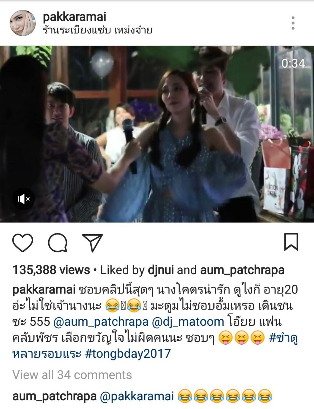และช็อตเด็ดของงานอยู่ที่นางเอกสาว อั้ม ที่โชว์เต้นแบบน่ารักๆ ในเพลง "ประวัติศาสตร์" ศิลปิน คริสติน่า อากีลาร์ ที่ดูแล้วเหมือนสาวอายุ 20 ปีเลยทีเดียว ซึ่ง ตอง โพสต์คลิปดังกล่าวลงไอจีส่วนตัว และเขียนว่า “ชอบคลิปนี้สุดๆ นางโคตรน่ารัก ดูไงก็อายุ 20 อะไม่ใช่เจ้านางนะ มะตูมไม่ชอบอั้มเหรอ เดินชนซะ 555 @aum_patchrapa @dj_matoom โอ๊ยย แฟนคลับพัชร เลือกขวัญใจไม่ผิดคนนะ ชอบๆ #ขำดูหลายรอบแระ #tongbday2017”