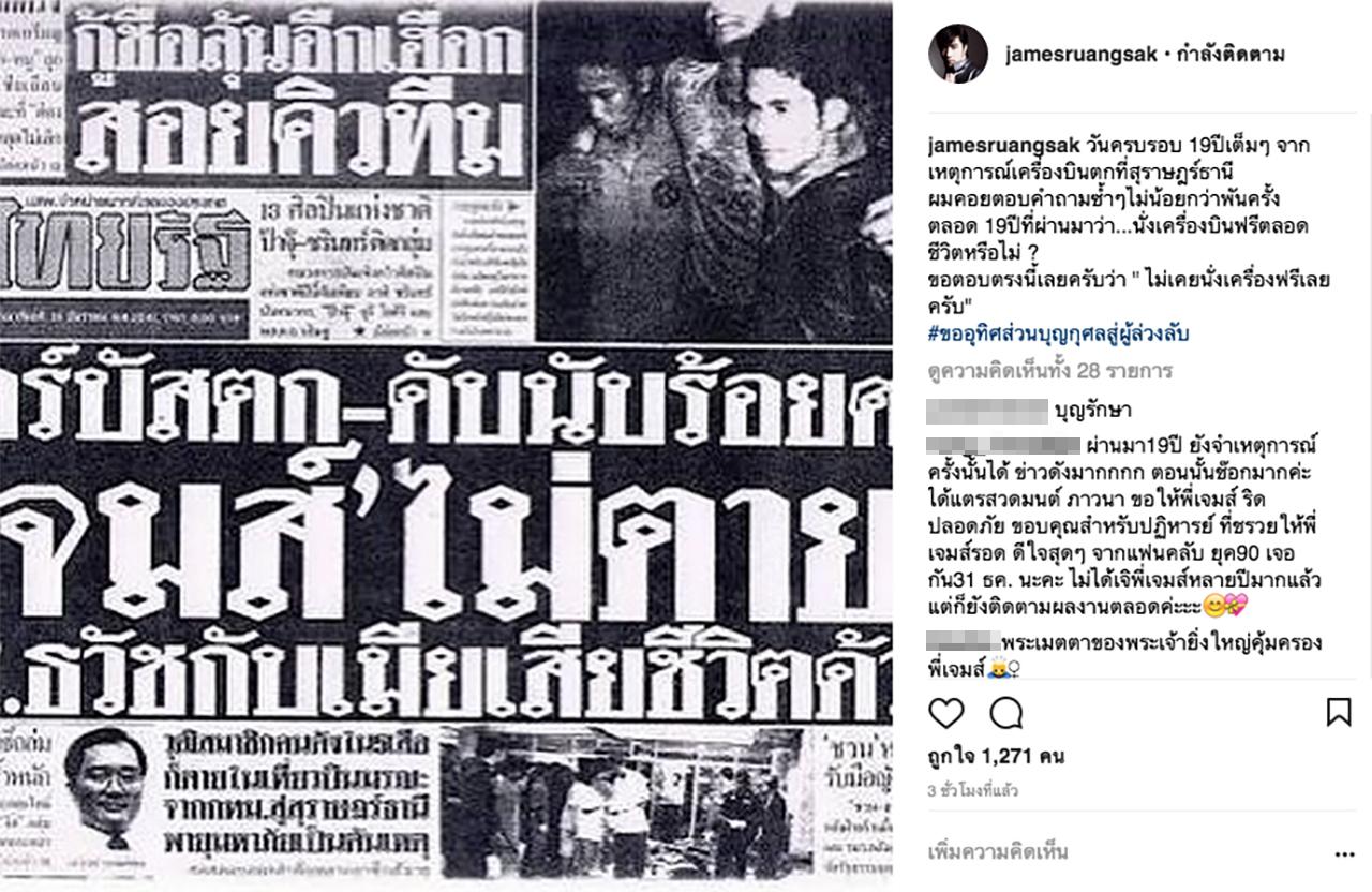 เรียกว่าเป็นปาฏิหาริย์ไม่น้อย สำหรับนักร้องหนุ่ม เจมส์ เรืองศักดิ์ ที่เมื่อ 19 ปีก่อน เคยผ่านวินาทีเฉียดตายมาแล้ว กับเหตุการณ์เครื่องบินของการบินไทย เที่ยวบิน TG261 ที่เดินทางจากกรุงเทพฯ ไปสุราษฎร์ธานี ตกที่ จ.สุราษฎร์ฯ จนทำให้มีผู้เสียชีวิตในที่เกิดเหตุ 101 คน และรอดชีวิต 45 คนเท่านั้น โดยหนึ่งในผู้รอดชีวิตจากเหตุการณ์นั้นคือหนุ่มเจมส์นั่นเอง