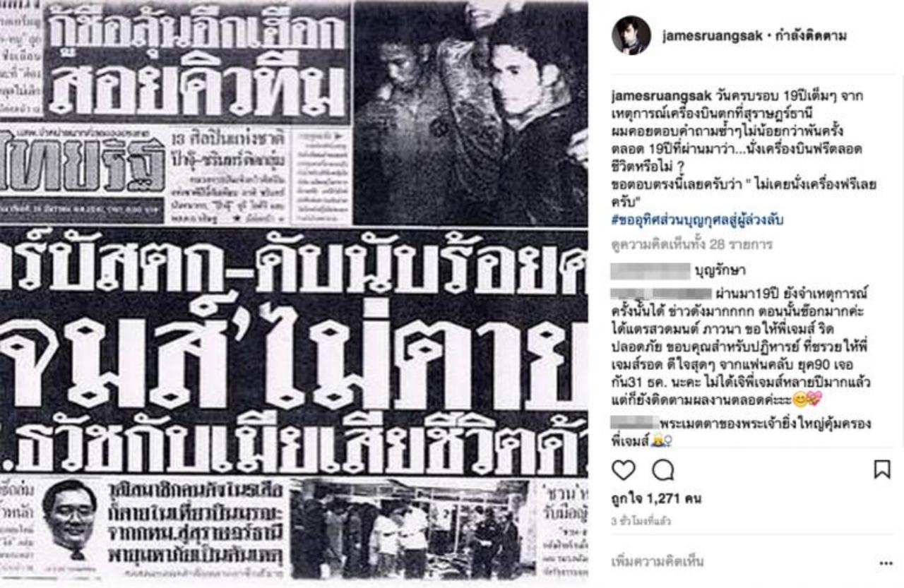 และหนึ่งในผู้รอดชีวิตเป็นนักร้องหนุ่มตี๋ข้าวมันไก่ เจมส์ เรืองศักดิ์ ลอยชูศักดิ์ ที่หลังเกิดเหตุการณ์ครั้งนั้นเจ้าตัวได้รับฉายาว่า “นักร้องกระดูกเหล็ก” ด้วย โดย เจมส์ ได้เล่าถึงเหตุการณ์ครั้งนี้อย่างละเอียดอีกครั้งในไลฟ์ของ Woody เมื่อวันที่ 11 ธ.ค. 2560 ที่ผ่านมา ซึ่งเป็นวันครบรอบ 19 ปีเหตุการณ์เครื่องบินตกในครั้งนั้นพอดีด้วย