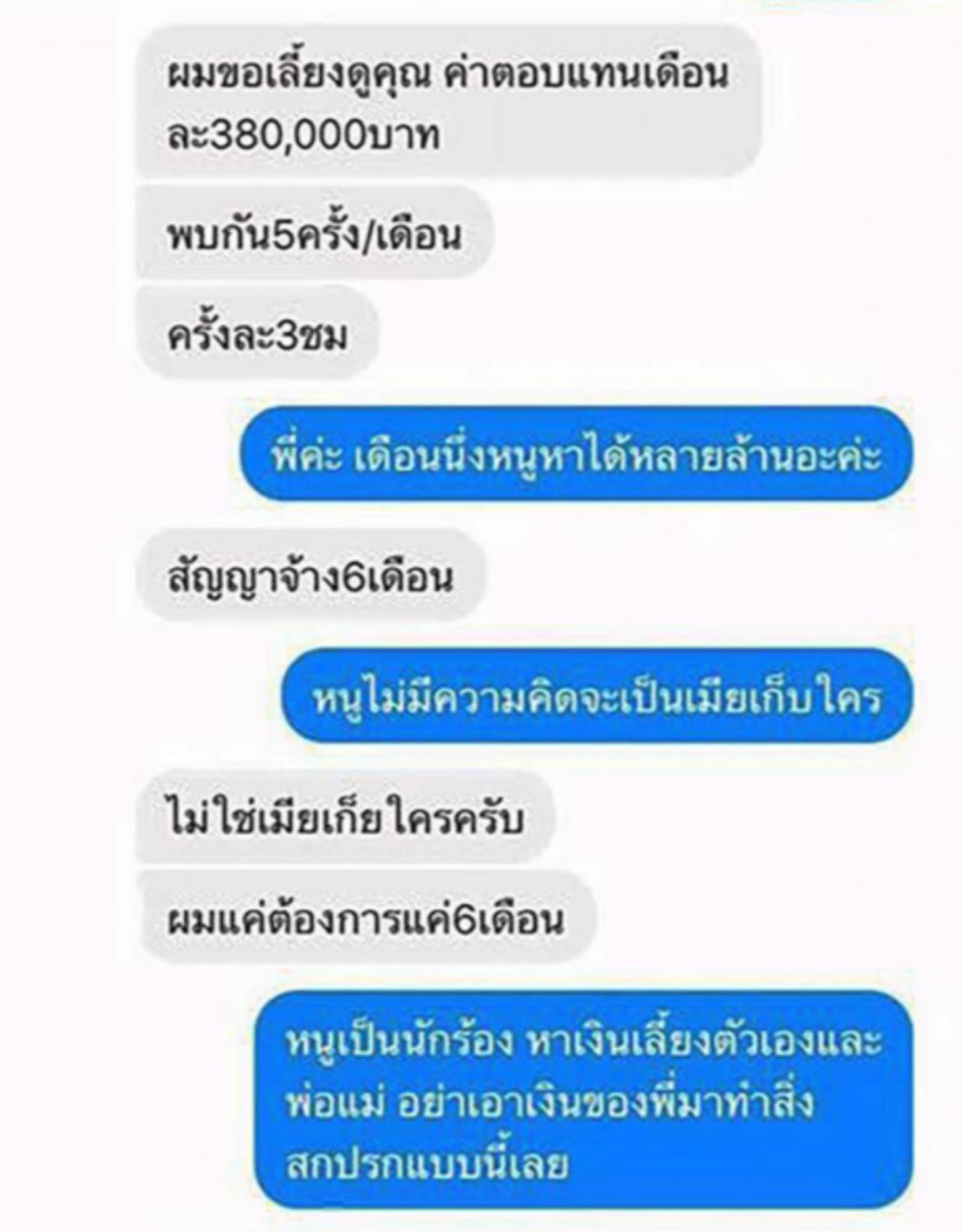 ซึ่งจะมีข้อความในทำนองเดียวกันว่า มาเสนอเงินค่าเลี้ยงดูหลักแสน พบกันเดือนละ 5 ครั้ง ครั้งละ 3 ชม. มีสัญญาจ้าง 6 เดือน และต้องเป็นเมียเก็บ คบกันแบบไม่ผูกมัด ซึ่งงานนี้สาวๆ ทุกคนที่เคยโดน ก็ได้โพสต์ข้อความแฉ พร้อมกับบอกว่า พวกเธอทำงานเดือนนึงได้เป็นล้าน ดีกว่ามานั่งเป็นเมียเก็บใคร และทั้งสามสาวยังมองว่า เป็นแค่ข้อความที่มาก่อกวนเท่านั้น เลยไม่ได้แจ้งความจับแต่อย่างใด แต่ได้เตือนเสี่ยหื่นรายนี้ว่า ขอให้หยุดการกระทำแบบนี้ซะ...