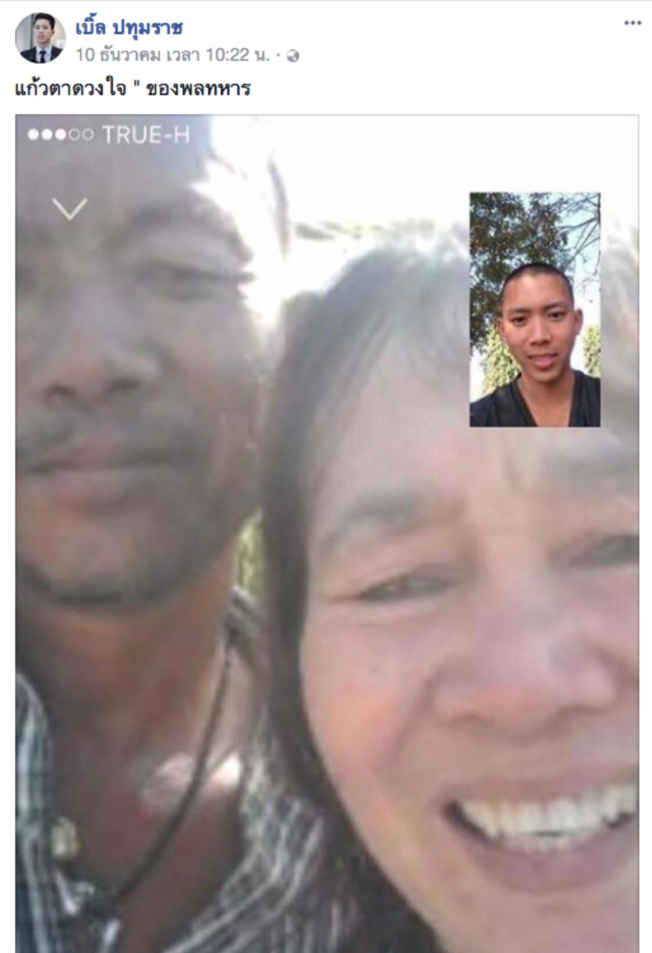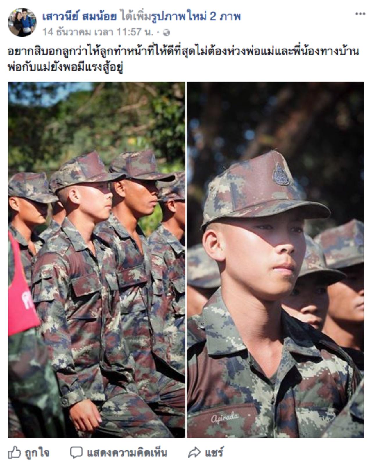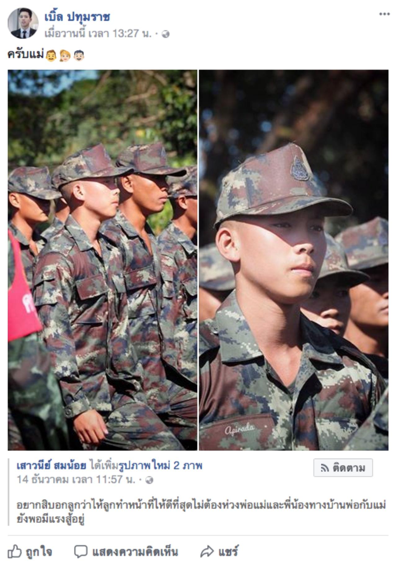 และล่าสุด แม่ของนักร้องหนุ่มได้โพสต์เฟซบุ๊กถึงลูกชาย ซึ่งเป็นรูปของพลทหารเบิ้ลกำลังฝึกทหารอยู่ พร้อมกับข้อความที่อ่านแล้วทำหลายคนซึ้งไม่น้อยว่า “อยากสิบอกลูกว่าไห้ลูกทำหน้าที่ไห้ดีที่สุด ไม่ต้องห่วงพ่อแม่และพี่น้องทางบ้าน พ่อกับแม่ยังพอมีแรงสู้อยู่” และเมื่อหนุ่มเบิ้ลได้เห็นข้อความของแม่ ก็ได้แชร์และรับปากแม่