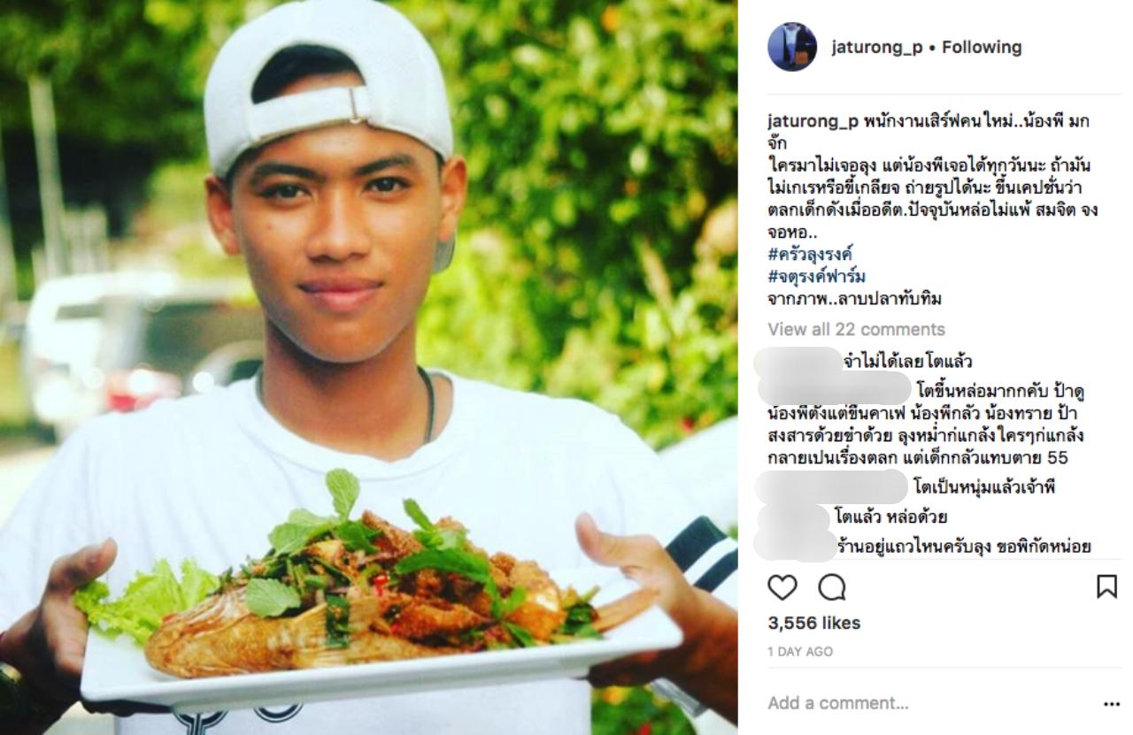 "พนักงานเสิร์ฟคนใหม่..น้องพี มกจ๊ก ใครมาไม่เจอลุง แต่น้องพีเจอได้ทุกวันนะ ถ้ามันไม่เกเรหรือขี้เกียจ ถ่ายรูปได้นะ ขึ้นแคปชั่นว่า ตลกเด็กดังเมื่ออดีต ปัจจุบันหล่อไม่แพ้ สมจิตร จงจอหอ.. #ครัวลุงรงค์ #จตุรงค์ฟาร์ม จากภาพ..ลาบปลาทับทิม"