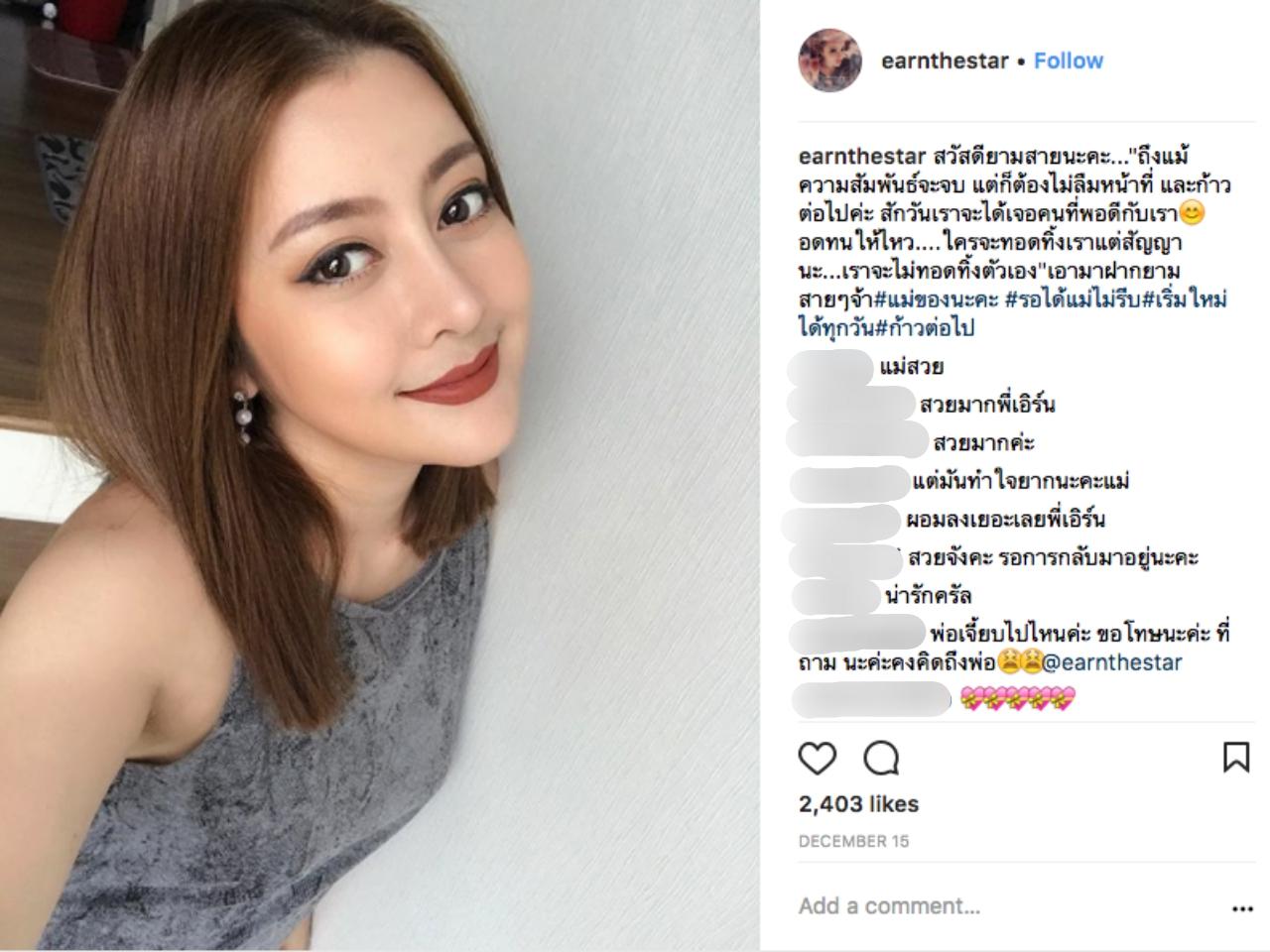 พร้อมทั้งข้อความส่อนัยรักร้าว "ถึงแม้ความสัมพันธ์จะจบ แต่ก็ต้องไม่ลืมหน้าที่ และก้าวต่อไปค่ะ สักวันเราจะได้เจอคนที่พอดีกับเรา อดทนให้ไหว....ใครจะทอดทิ้งเรา แต่สัญญานะ...เราจะไม่ทอดทิ้งตัวเอง".