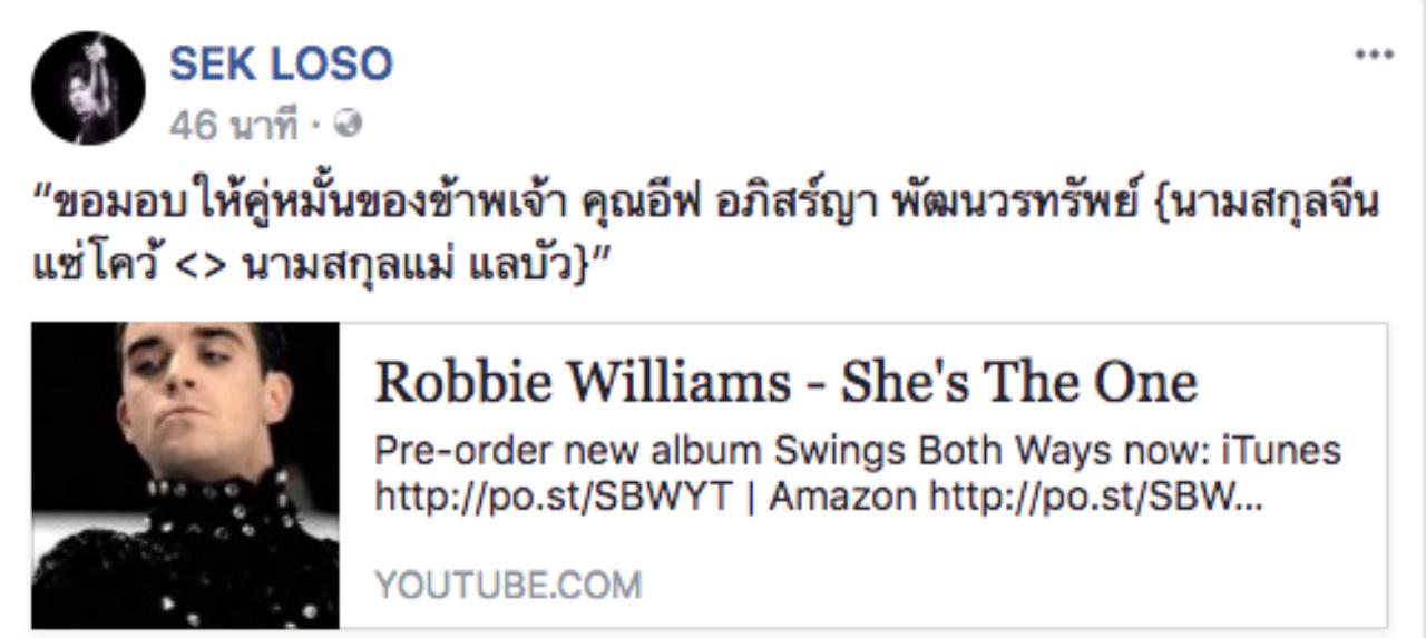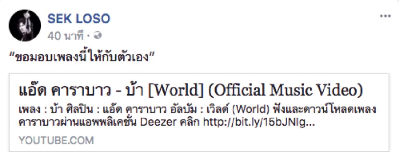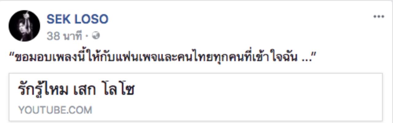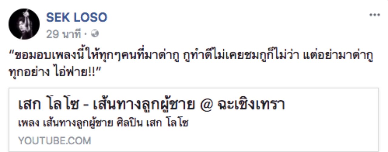 และงานนี้ในเฟซบุ๊กของ เสก โลโซ ก็ได้โพสต์ข้อความ พร้อมกับเพลงเชิงตัดพ้อในทำนองว่า ขอมอบเพลงนี้ให้กับทุกคนที่เข้ามาด่า ตอนที่ทำดีแล้วไม่เคยชม ก็ไม่ว่าอะไร แต่อย่ามาด่าตนเองทุกอย่าง.