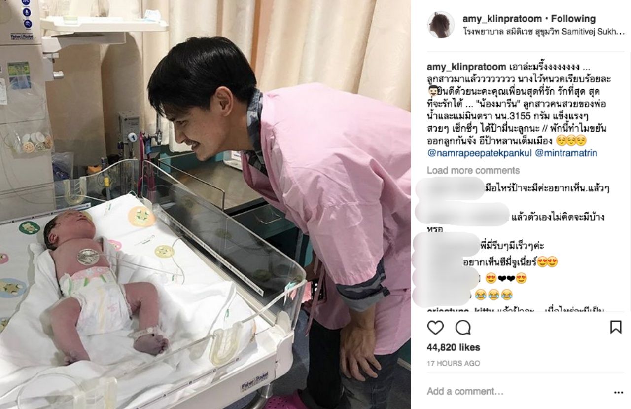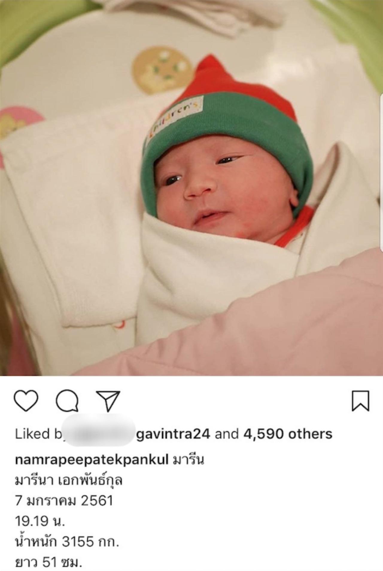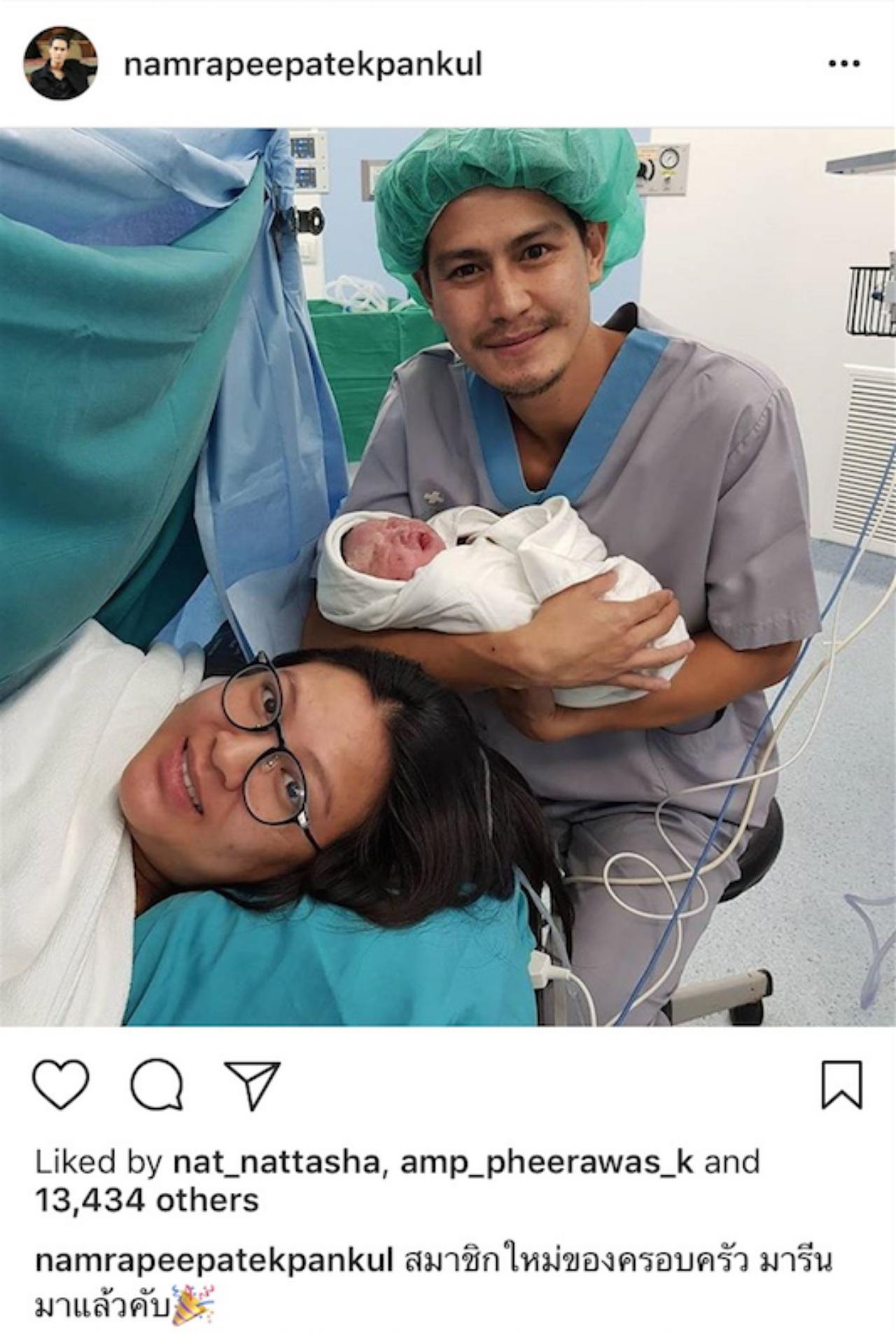 โดยหนุ่มน้ำได้โพสต์รูปภาพ 3 พ่อแม่ลูกในอินสตาแกรมของตัวเอง พร้อมกับโพสต์ข้อความว่า “สมาชิกใหม่ของครอบครัว มารีนมาแล้วครับ” และอีกรูปเป็นรูปของลูกสาวที่หน้าตาน่าเกลียดน่าชังสุดๆ ซึ่งงานนี้ก็มีเพื่อนพ้องในวงการเข้ามาแสดงความยินดีกับหนุ่มน้ำมากมาย โดยเฉพาะสาวเอมี่ กลิ่นประทุม ที่แอบแซวว่าหนุ่มน้ำไว้หนวดรอลูกสาวคนสวยเรียบร้อยแล้ว