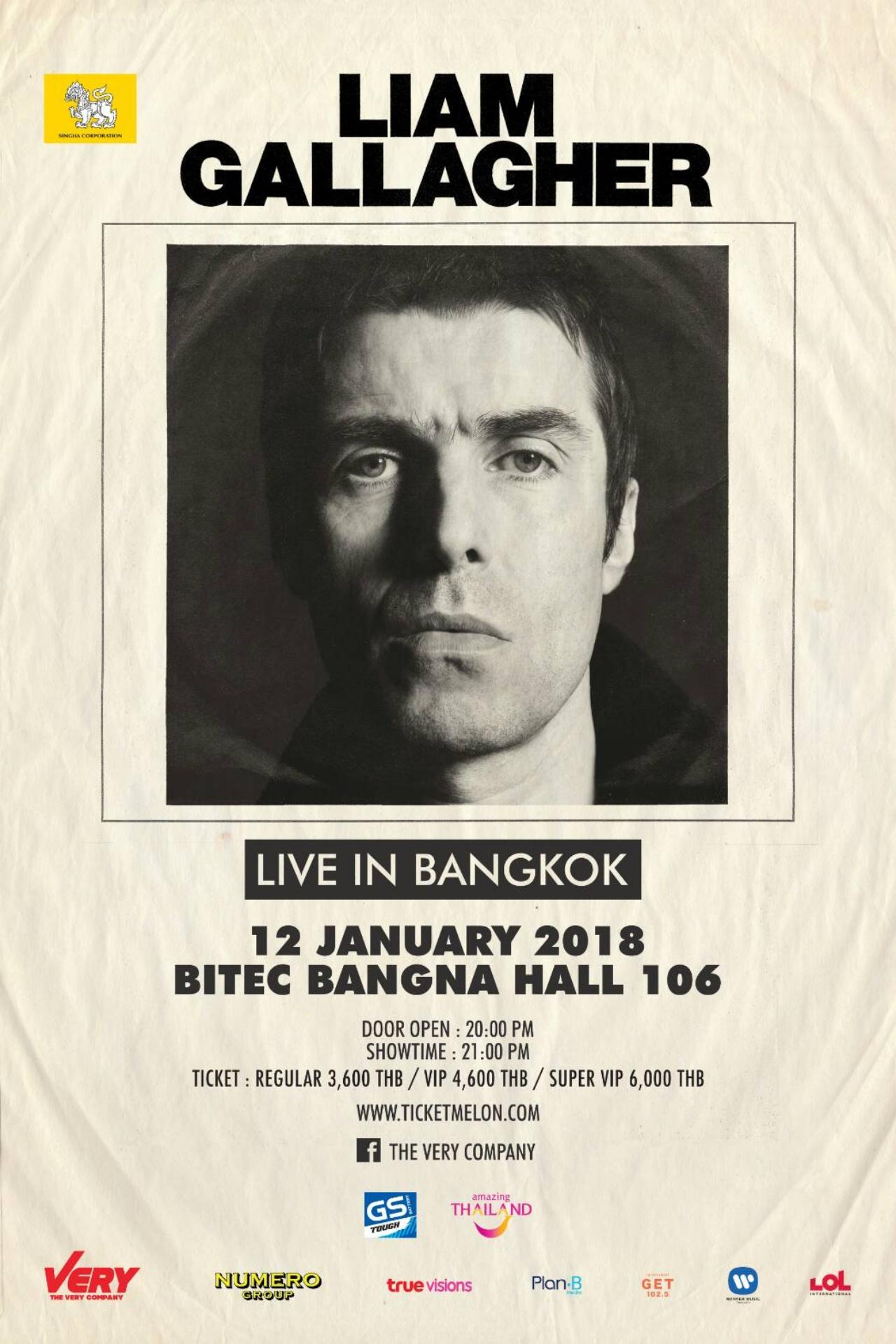 เตรียมพบกับตำนานเพลงร็อกคนนี้ได้ใน “LIAM GALLAHER LIVE IN BANGKOK” วันศุกร์ที่ 12 มกราคม 2561 ที่ BITEC BANGNA HALL 106 ประตูเปิด 19:00 น เเละการแสดงเริ่ม 21:00 น บัตร Regular ราคา 3,600 บาท เเละ VIP ราคา 4,600 และ Super VIP Lounge ราคา 6,000 บาท ซื้อบัตรได้ที่ http://www.ticketmelon.com/event/LiamGallagher