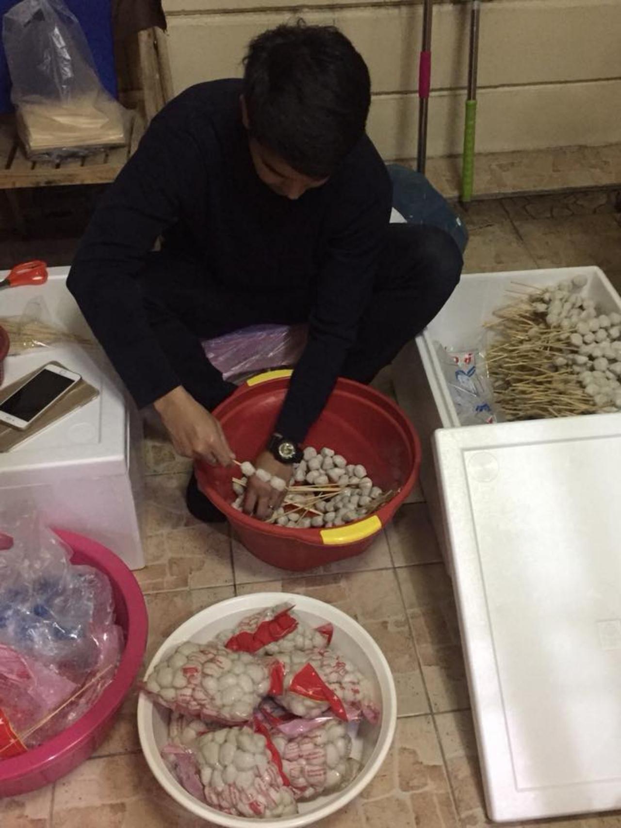 คือจัดการทำเองทั้งหมดเลยตามภาพที่เห็นเลย ผมเริ่มตั้งแต่ซื้อลูกชิ้น ซื้อไม้เสียบลูกชิ้น เอาลูกชิ้นมาล้าง มานั่งเสียบไม้ เอาลูกชิ้นมาปิ้งขาย จนกระทั่งราดน้ำจิ้มให้ลูกค้าและได้รับเงินไม้ละ 12 บาท คือมันเป็นอะไรที่มีความสุขมากครับ”