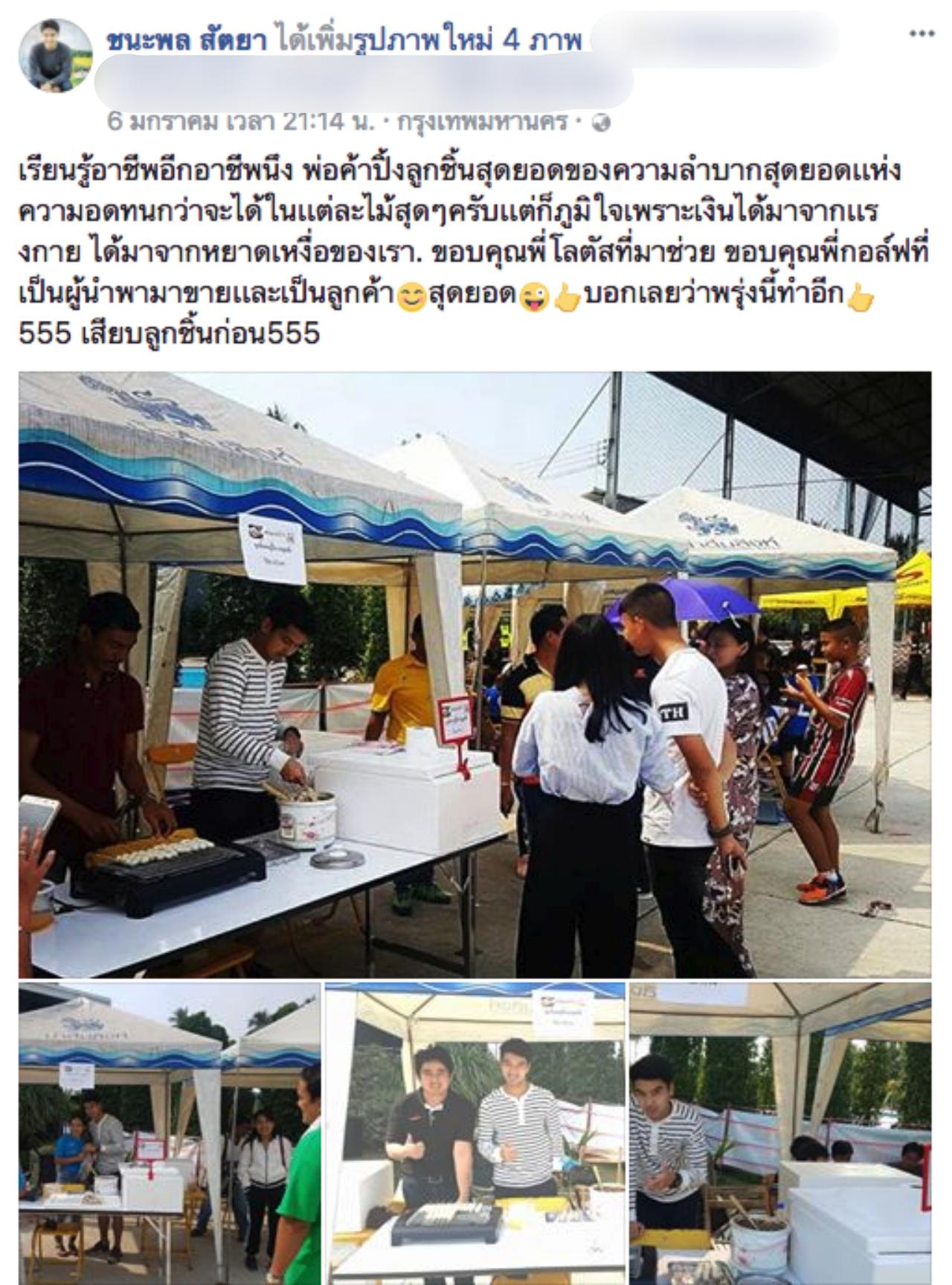 "แต่ที่คนเห็นภาพของผมทำงานอดิเรกซึ่งก็คือการเสียบลูกชิ้นขายนั้น จริงๆ มันเป็นงานที่ดีมากเลยนะครับ แต่ผมต้องขอเล่าก่อนว่า ส่วนตัวผมเองผมก็มีร้านไก่ทอดเป็นธุรกิจของตัวเองอยู่ แต่บังเอิญวันนั้นผมได้ไปร่วมชมการแข่งขันฟุตบอลเยาวชนตามคำชวนของสปอนเซอร์ทีมที่ผมรู้จัก ซึ่งผมก็คิดว่าผมไม่อยากไปดูเฉยๆ