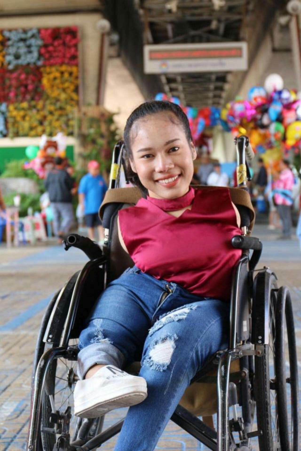 วันหนึ่งวิทยาการก้าวไกลแล้ว น่าจะต่อแขนขาได้ ฝ้ายอยากทำมั้ยคะ จะได้เหมือนคนทั่วไป? "เคยมีคุณหมอมาดูแล้วค่ะ แขนต่อไม่ได้ เพราะหนูไม่มีข้อต่อยาวออกมาเลย ส่วนขาหนูมีขาเทียมค่ะ แต่ใส่ไม่ได้ เพราะหลังหนูงอ เวลาเดินมันไม่บาลานซ์กันค่ะ ส่วนตัวก็อยากต่อนะคะ แต่ในเมื่อมันไม่ได้ เราก็แฮปปี้กับสิ่งที่เหลือค่ะ"