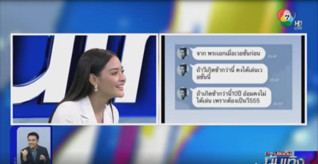 โดยมีข้อความไลน์ของวีโชว์ที่หน้าจอว่า “พี่ต้าๆๆๆๆ ฝากบอกปุ๊กลุกด้วย ว่าวีเสียดายไม่ได้ไปทำพิธีกรเจาะประเด็นบันเทิง ที่ปุ๊กลุกมา ติดธุระด่วน ขอให้แม่อายสะอื้นเรตติ้งปังๆๆ นะ จากพระเอกเมื่อเวอร์ชั่นก่อน ถ้าวีเกิดช้ากว่านี้ คงได้เล่นเวอร์ชั่นนี้ ถ้าเกิดช้ากว่านี้ 10 ปี อ๋อมคงไม่ได้เล่น เพราะต้องเป็นวี 555”