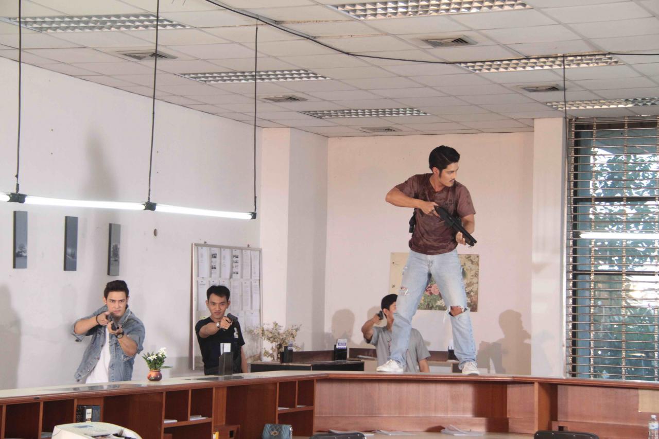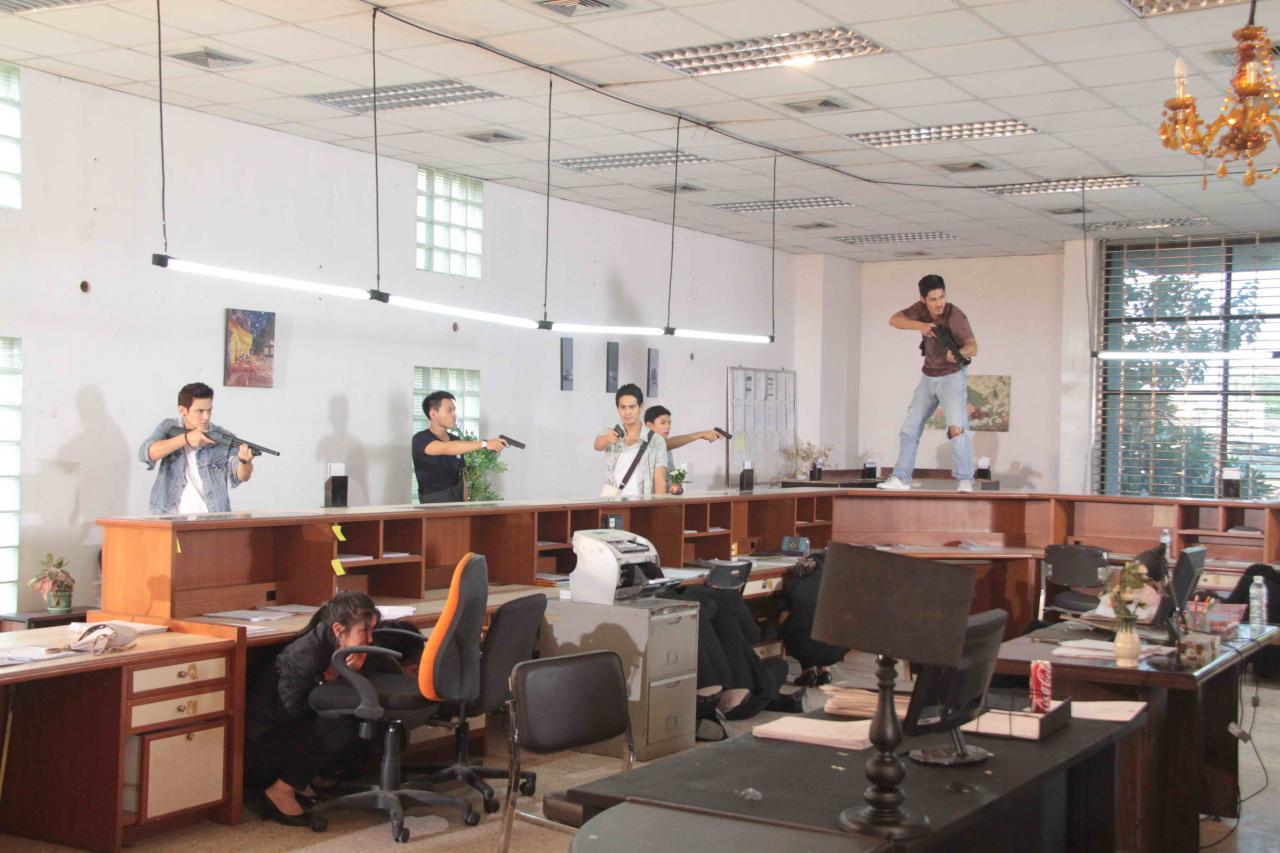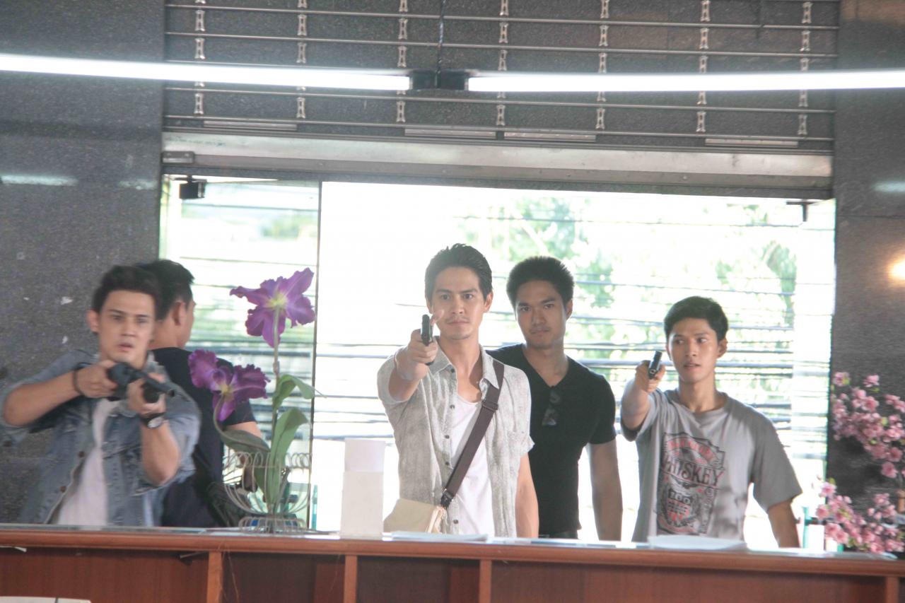 ถ่ายทำกันที่ธนาคารกลางเมืองกาญจนบุรี ใกล้ๆ สี่แยก เล่นเอาถึงกับต้องปิดถนนกันเลยทีเดียว เพราะต้องมีฉากที่ตำรวจขับรถมา และแก๊งตี๋ใหญ่ขับรถหนี พอได้ฤกษ์ น้ำหัวหน้าแก๊งก็ไม่พูดพร่ำทำเพลง เปิดฉากปล้นแบบฉับไว กวาดทรัพย์สินไปเพียบ