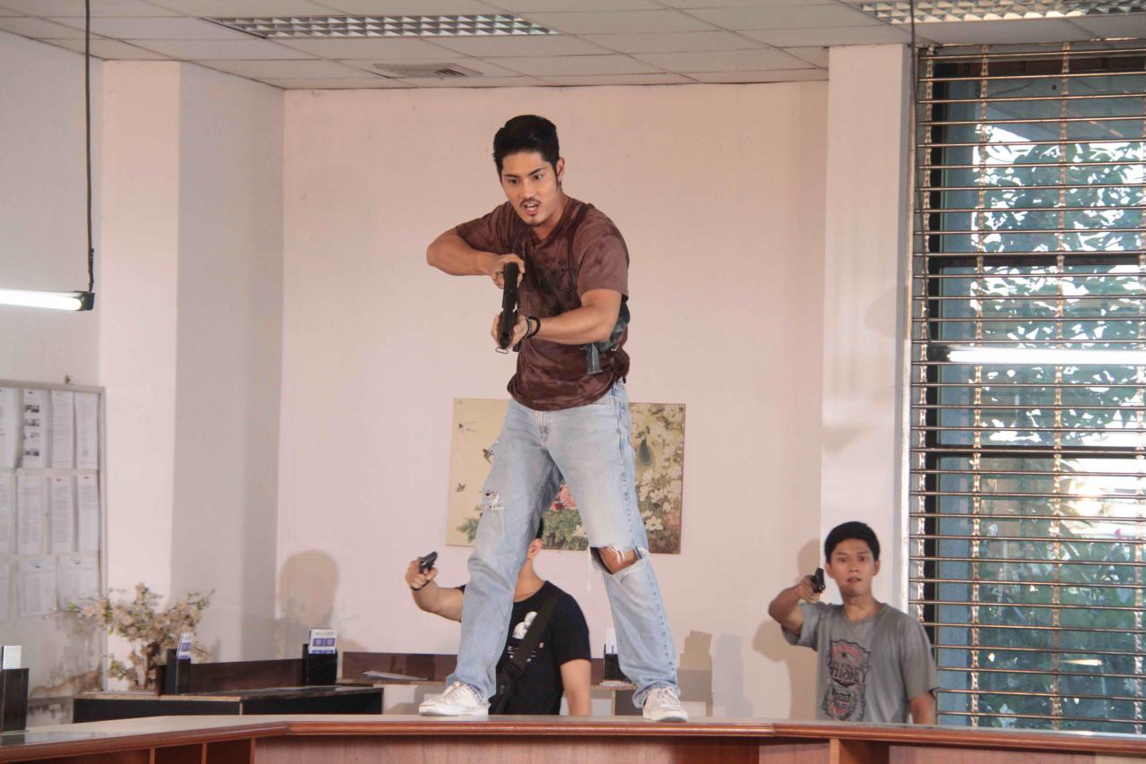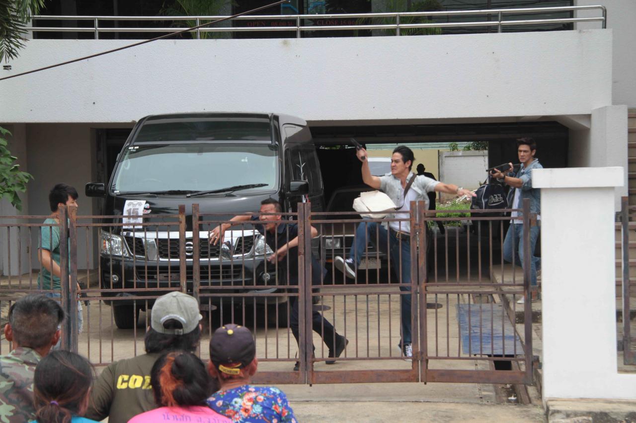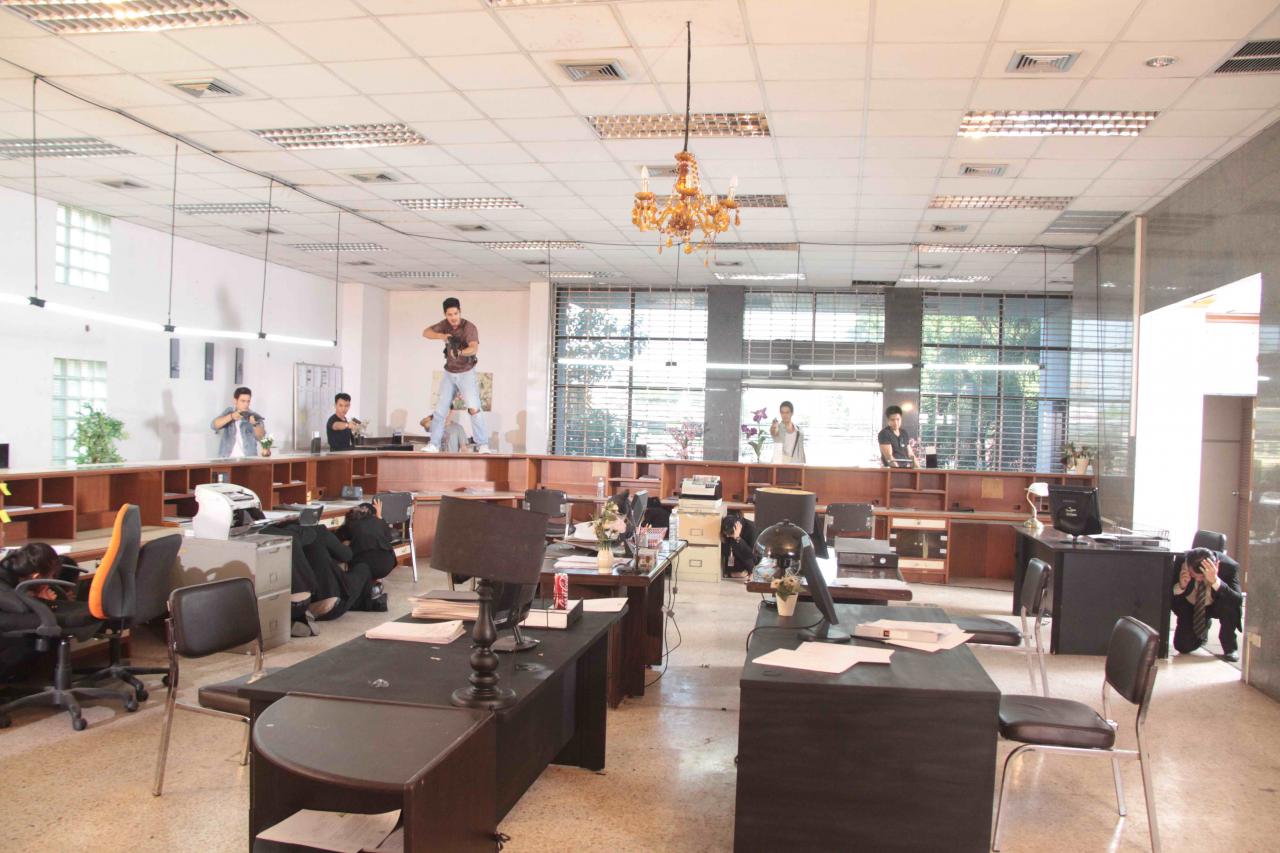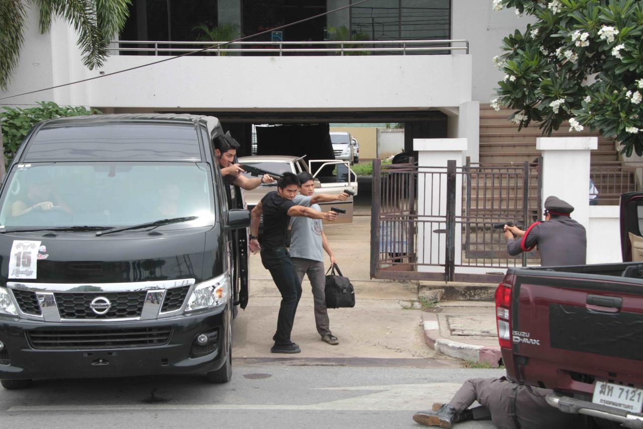 ถ่ายทำกันที่ธนาคารกลางเมืองกาญจนบุรี ใกล้ๆ สี่แยก เล่นเอาถึงกับต้องปิดถนนกันเลยทีเดียว เพราะต้องมีฉากที่ตำรวจขับรถมา และแก๊งตี๋ใหญ่ขับรถหนี พอได้ฤกษ์ น้ำหัวหน้าแก๊งก็ไม่พูดพร่ำทำเพลง เปิดฉากปล้นแบบฉับไว กวาดทรัพย์สินไปเพียบ