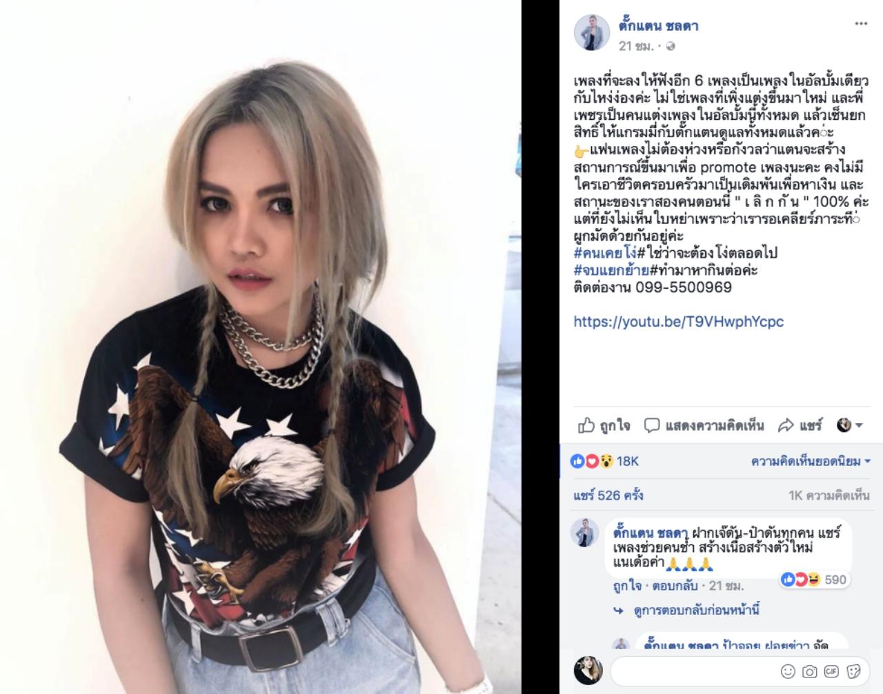 แฟนเพลงไม่ต้องห่วงหรือกังวลว่า แตนจะสร้างสถานการณ์ขึ้นมาเพื่อ promote เพลงนะคะ คงไม่มีใครเอาชีวิตครอบครัวมาเป็นเดิมพันเพื่อหาเงิน และสถานะของเราสองคนตอนนี้ " เ ลิ ก กั น " 100% ค่ะ